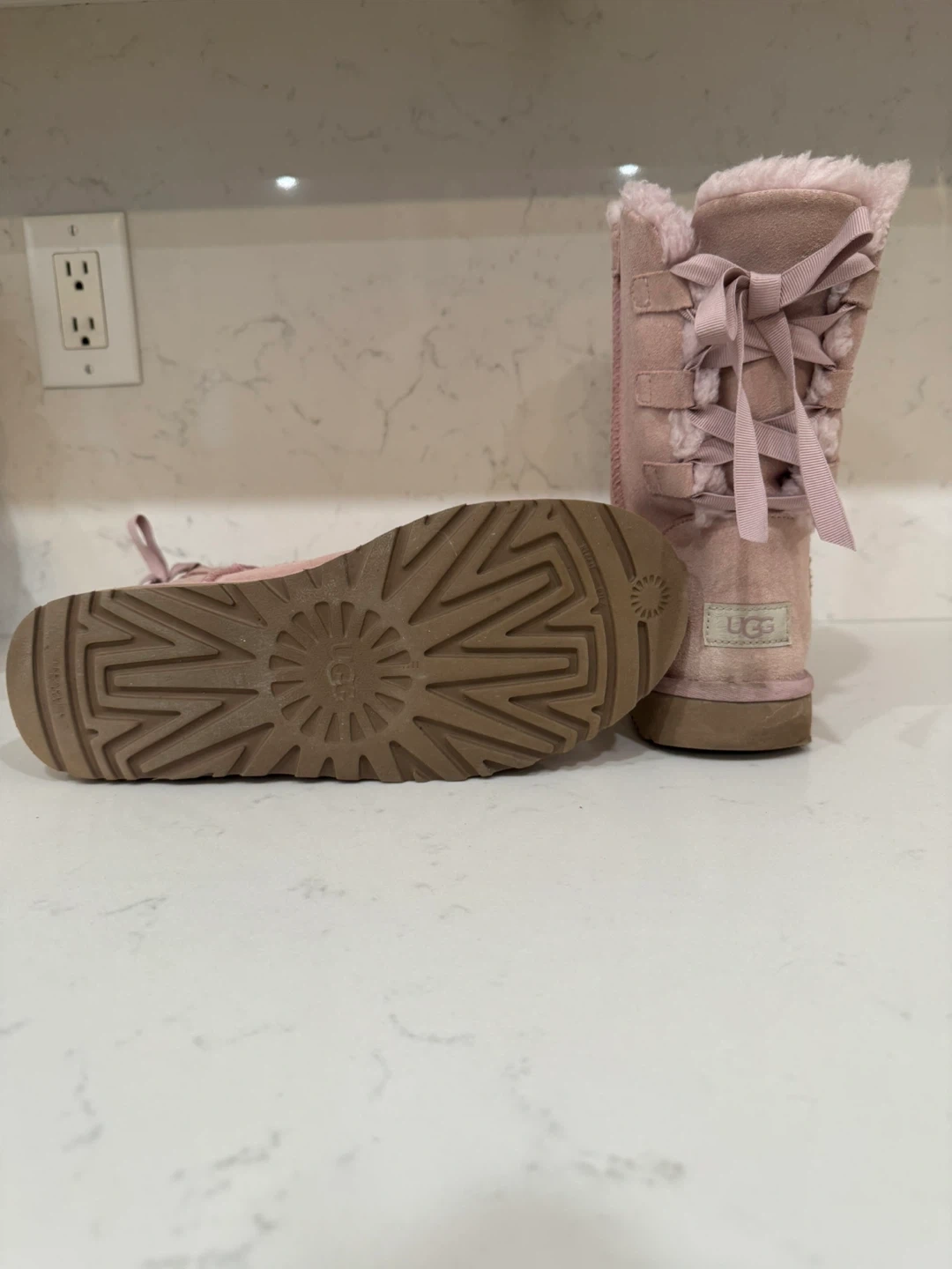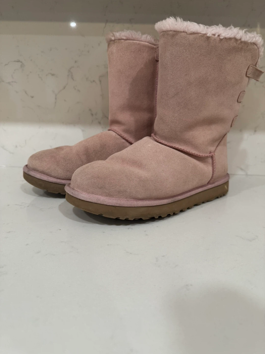 Selling a pair of UGG Bailey bow boots in a lovely pink suede! They're a women's size 11 and feature cute ribbon detailing on the back. Perfect for keeping your feet warm and stylish during the colder months