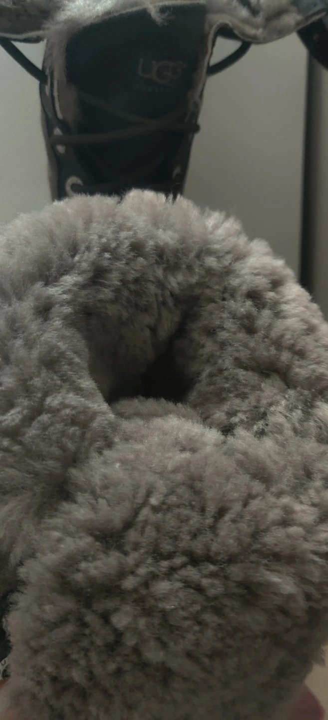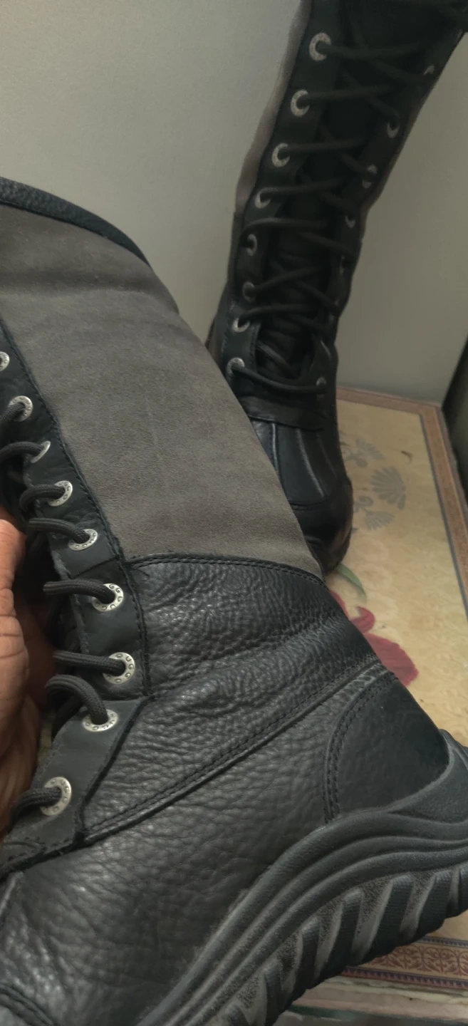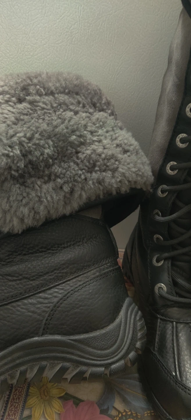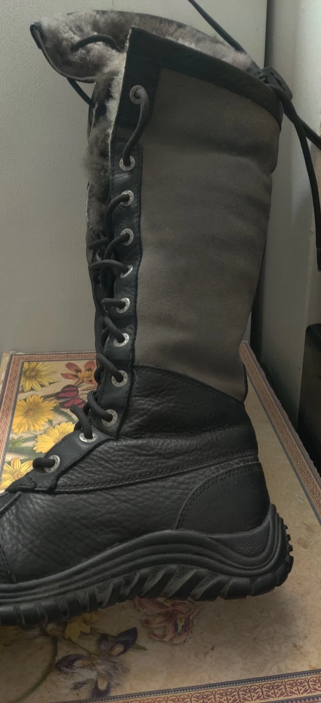 1000+Cozy and stylish UGG winter boots in black leather! These boots are perfect for keeping your feet warm and dry during the cold Canadian winters. These noots are knee high but foldable. Worn twice. Price is firm. Boots are leather.