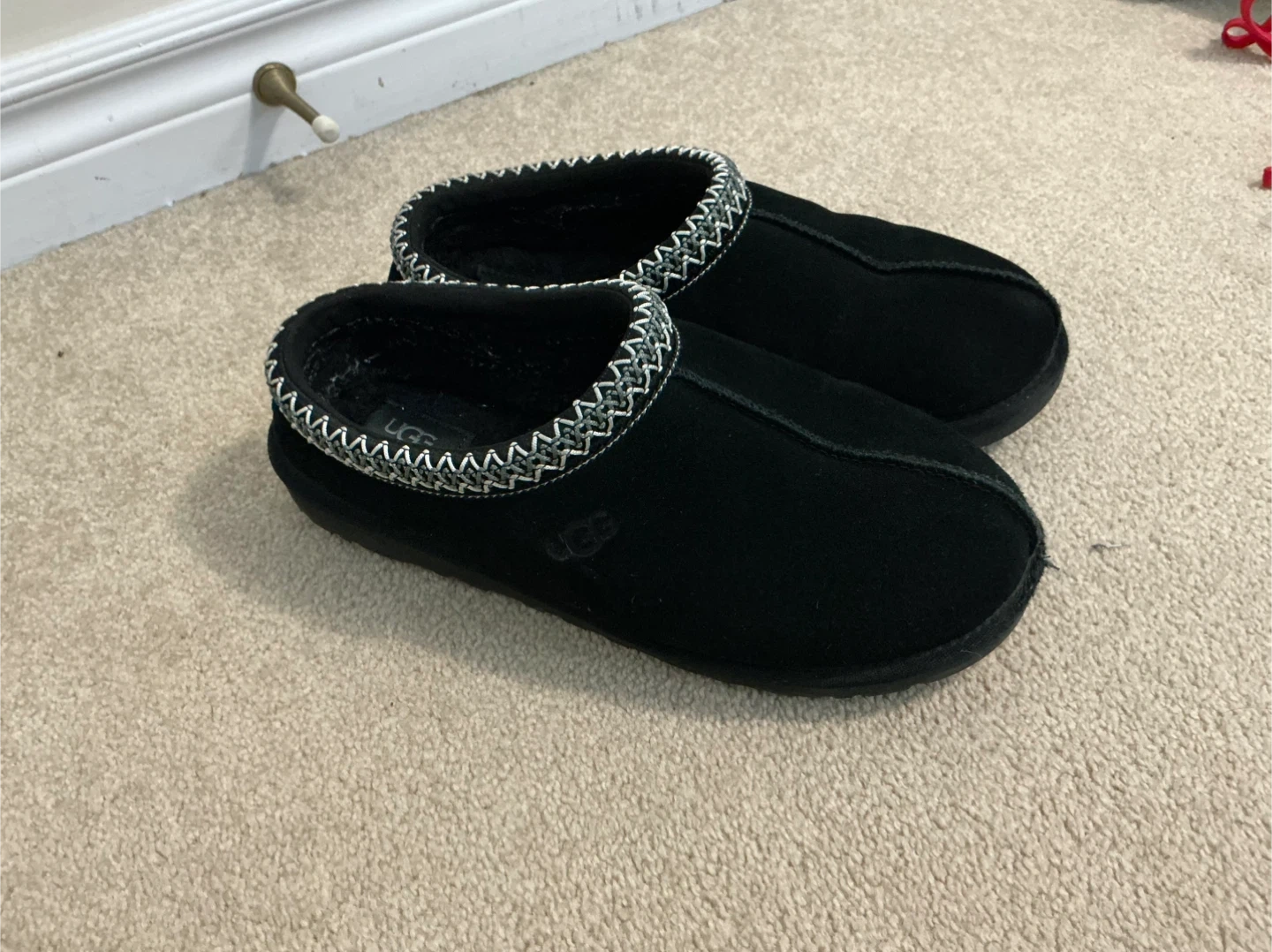 5Cozy up with these UGG slippers! They're a stylish black suede and a size 9. Perfect for wearing around the house!