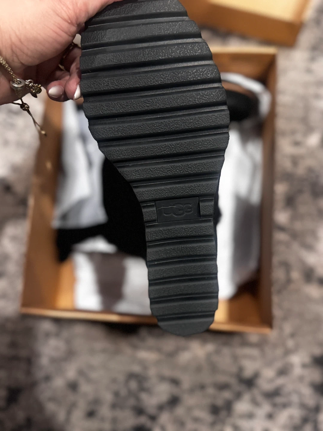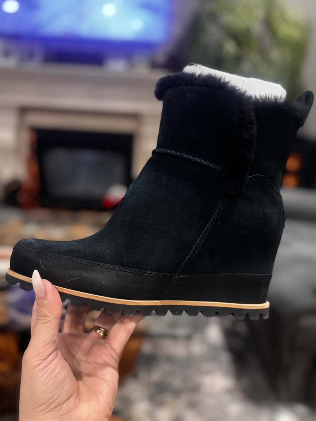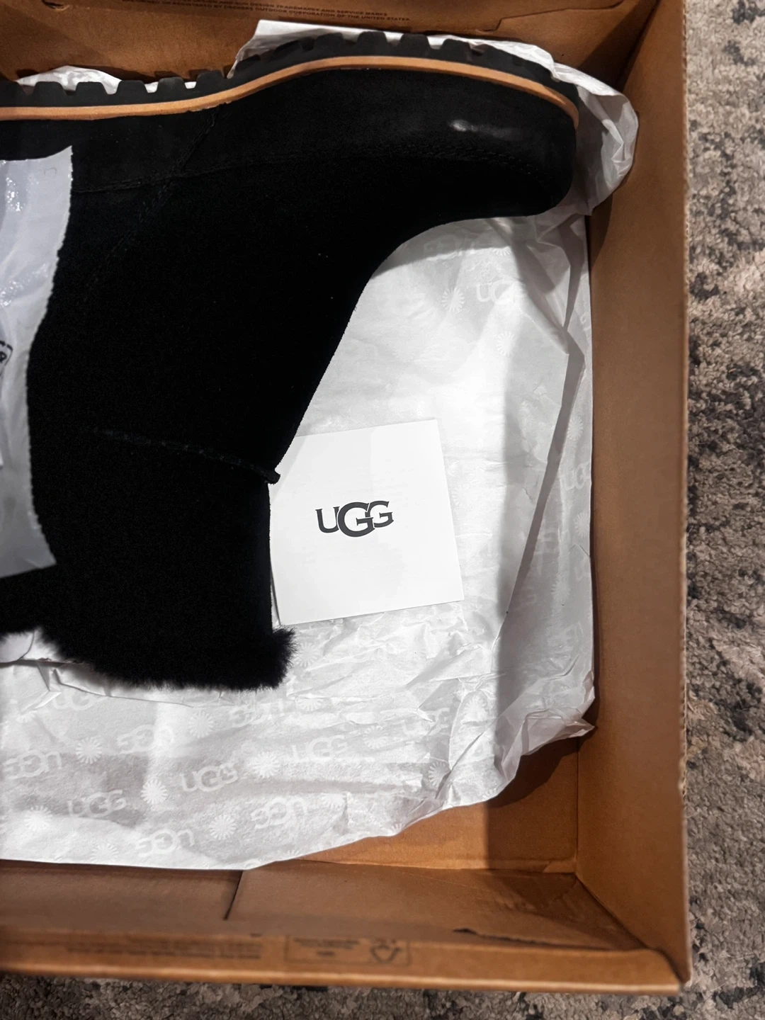 65Selling a pair of UGG black wedge booties in size 9 1/2 fit like a size 9 .. NEVER BEEN WORN.They come with the original box and are in great condition! Perfect for adding a bit of height while staying comfy and warm for the Canadian winter