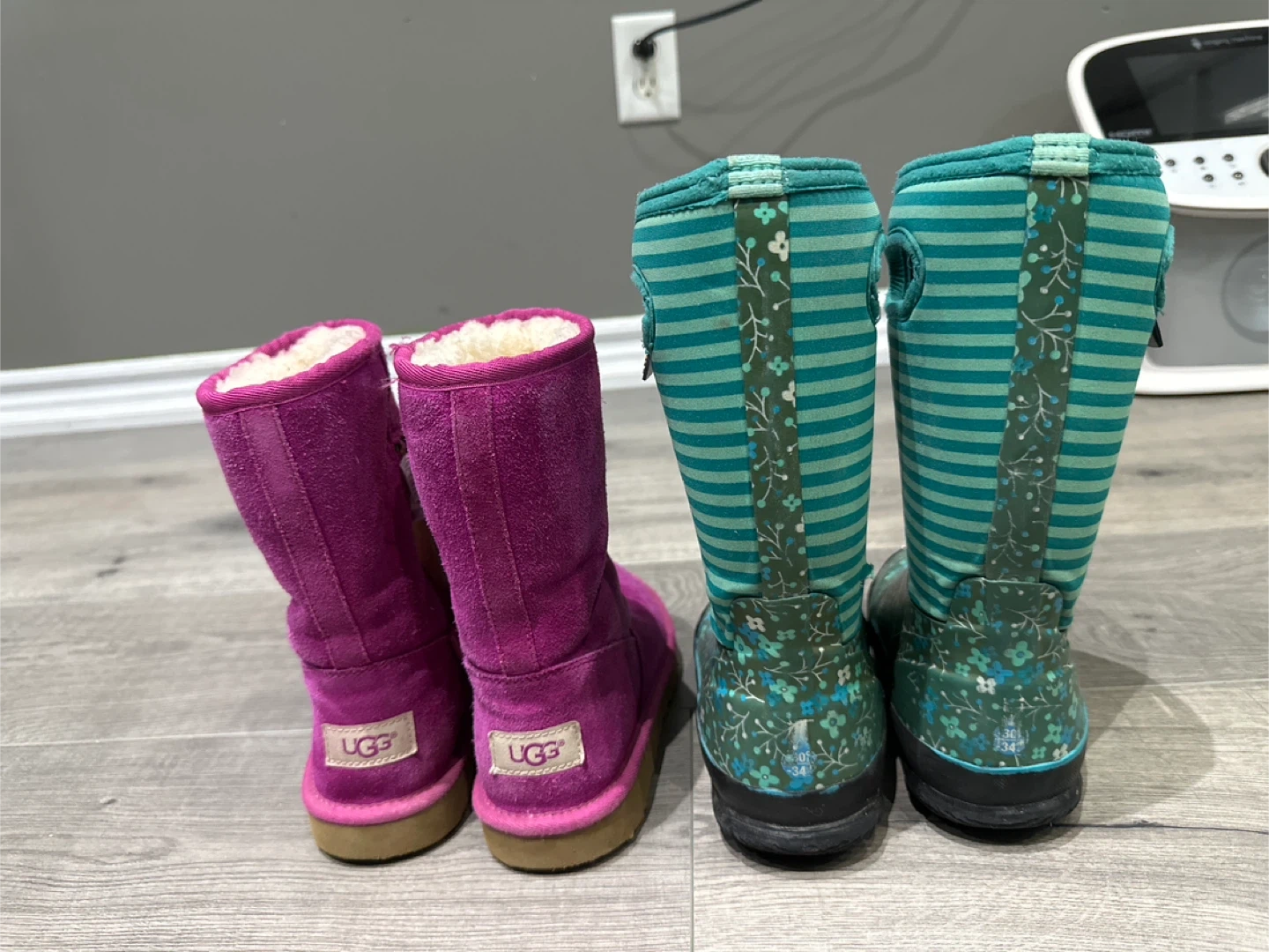 60Selling a bundle of kids' boots! Included are a pair of UGG boots in pink, and a pair of Bogs waterproof boots in a fun floral and stripe pattern. Both are in size 1 US. Great for keeping little feet warm and dry!