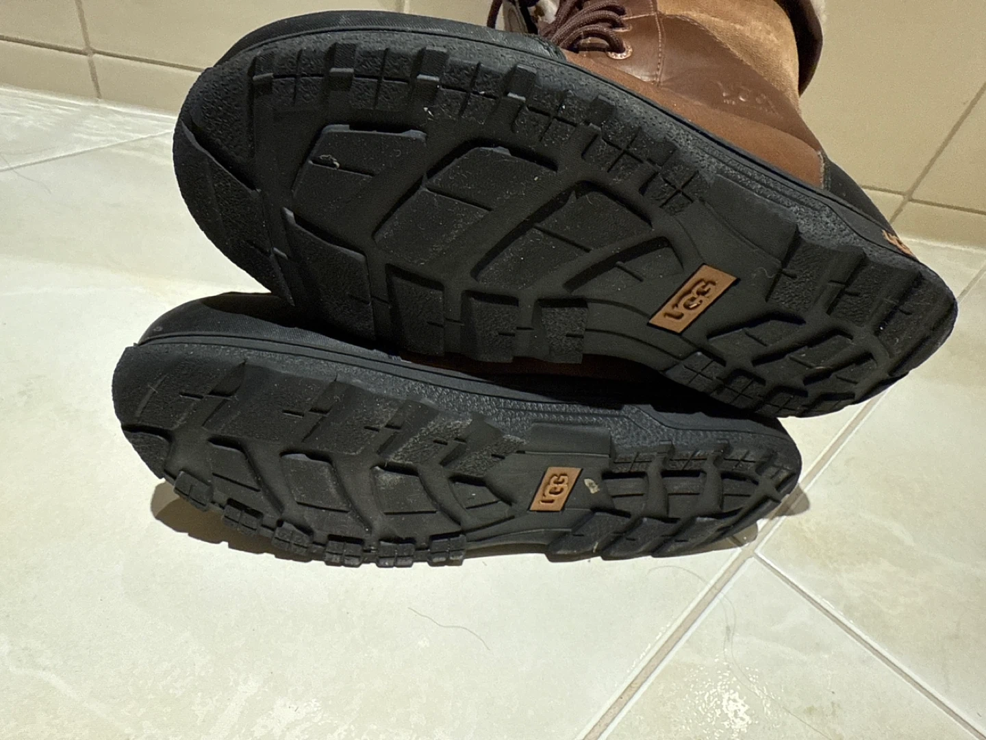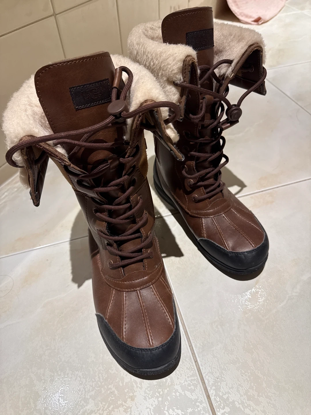 10Selling a pair of Ugg boots in brown leather. They're a women's size 6 (US). These boots are in great condition and ready for the cold weather!