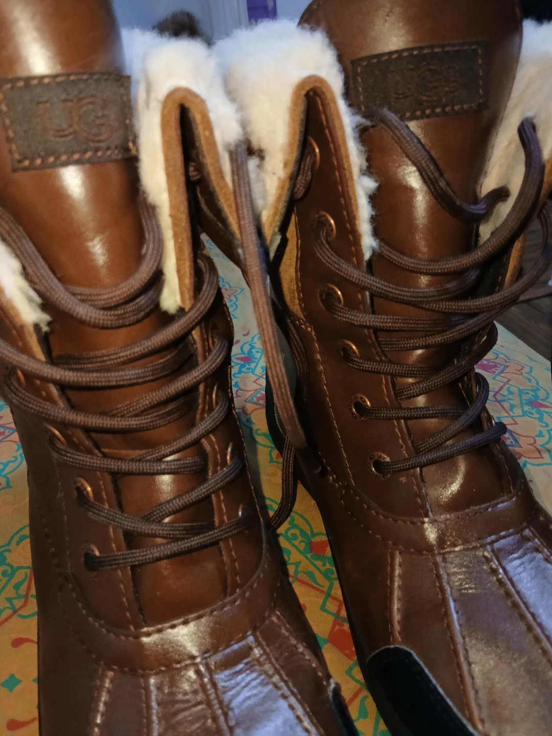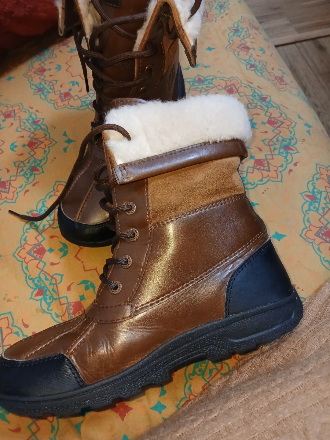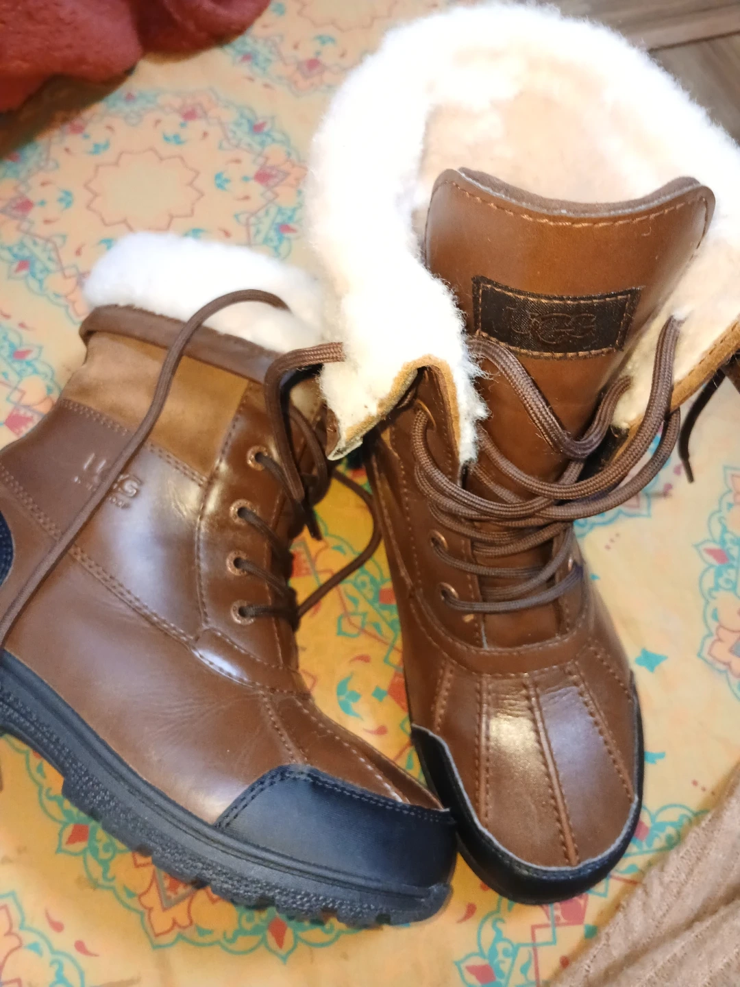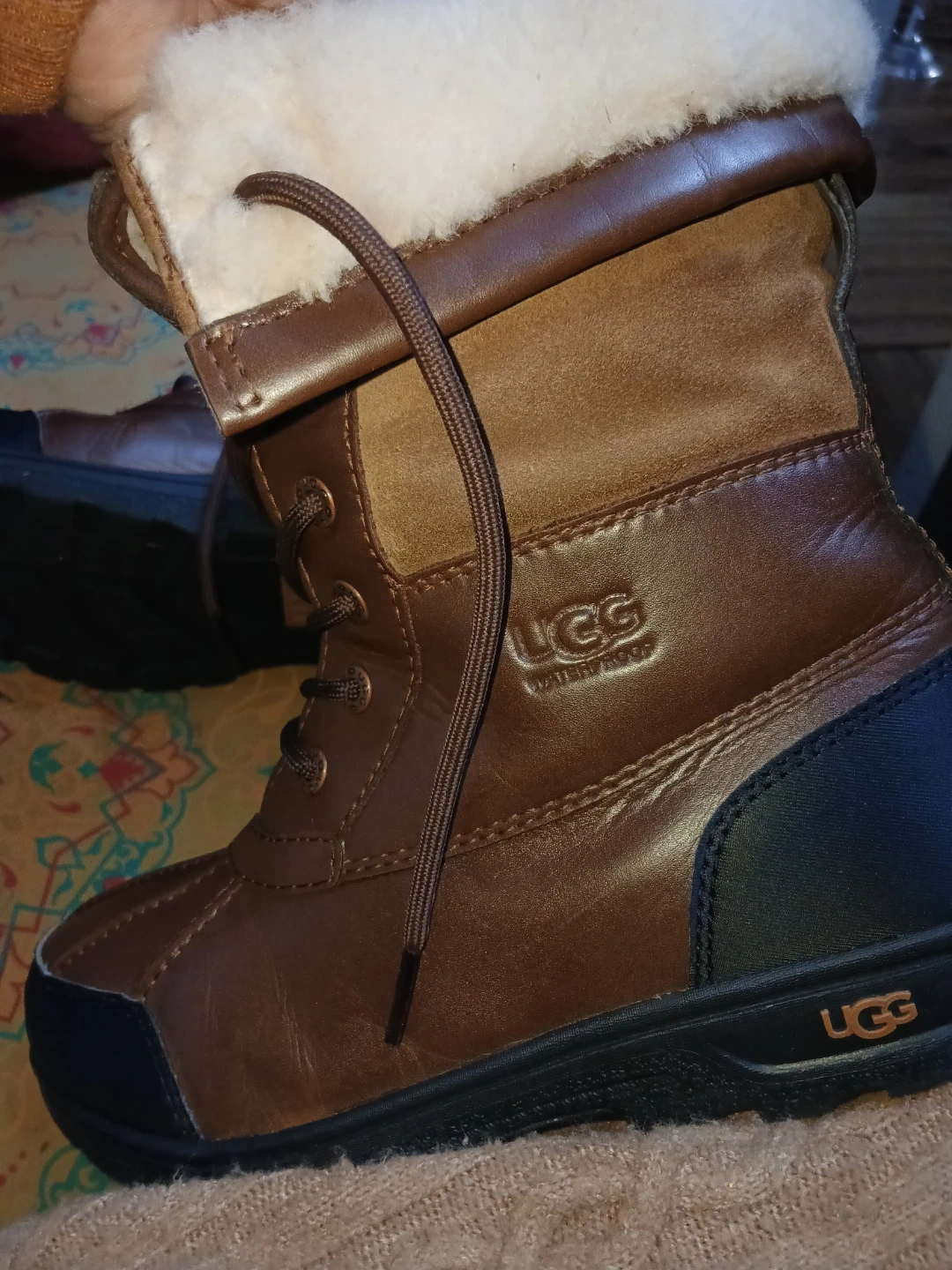25Here are a pair of UGG winter boots in brown leather. They look super warm and comfy for the winter months! The soles are in great condition, and the fur lining looks very plush