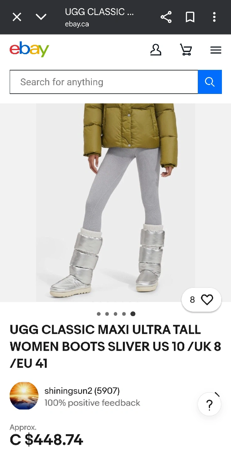 65Selling a pair of UGG Classic Maxi Ultra Tall Women's boots in silver, size US 10 / UK 8 / EU 41. Originally bought for $448.74. These boots are super stylish and will keep you warm during the cold months! They feature a unique, puffy design with detachable parts. Only used a couple times so its still in good condition.