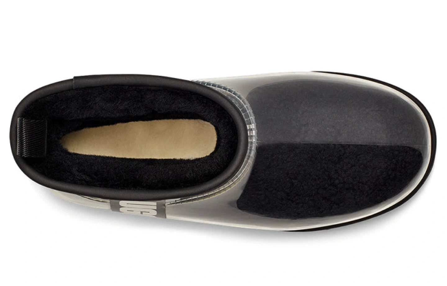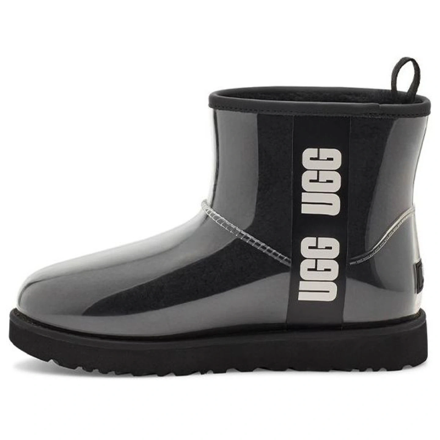 These UGG clear boots are super stylish and in great condition! They're a size 10 and would be perfect for rainy days or adding a unique touch to your outfit. The UGG logo is prominently displayed on the side. They feature a cozy inner lining