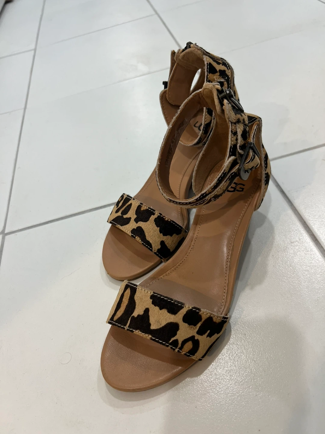 Cute UGG sandals with a fun leopard print! These are a size 5. They feature a zipper closure at the back. Perfect for adding a bit of flair to your outfits!