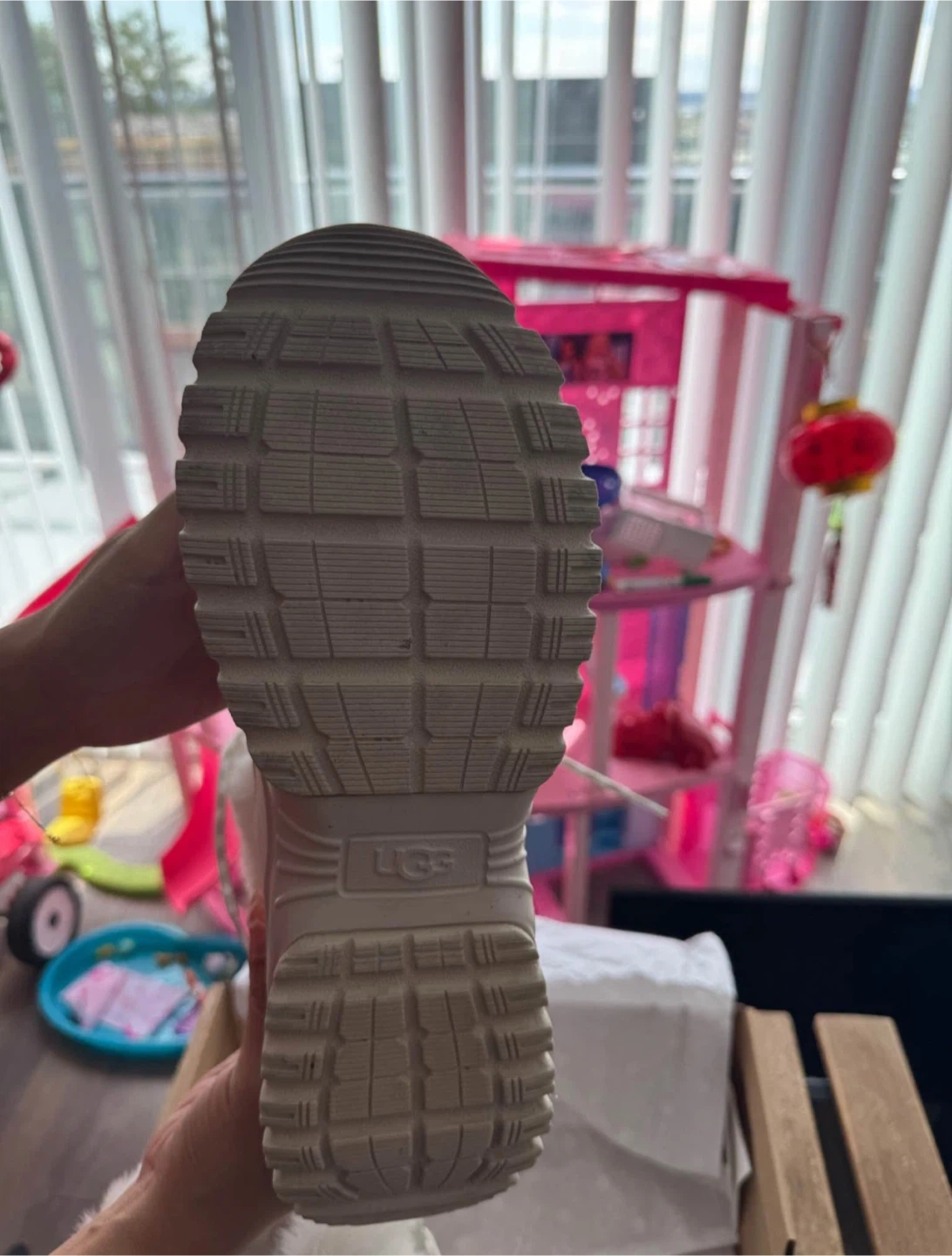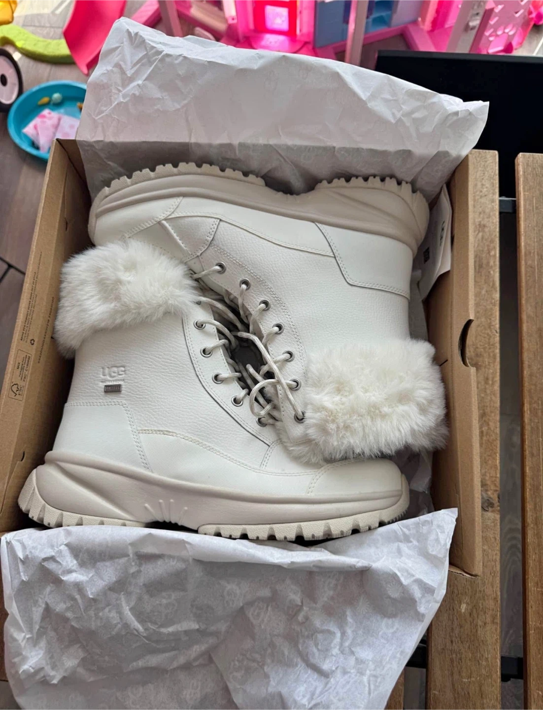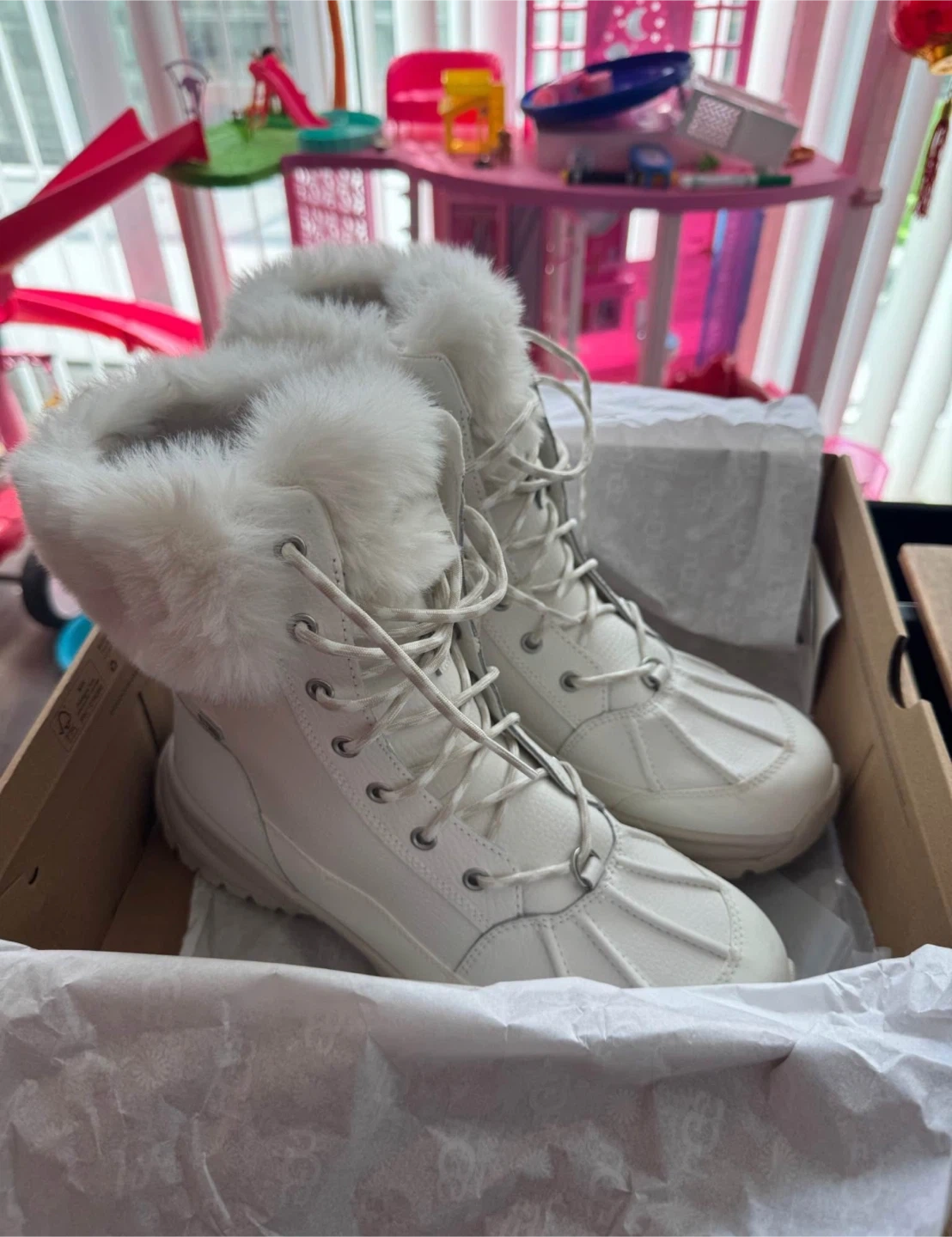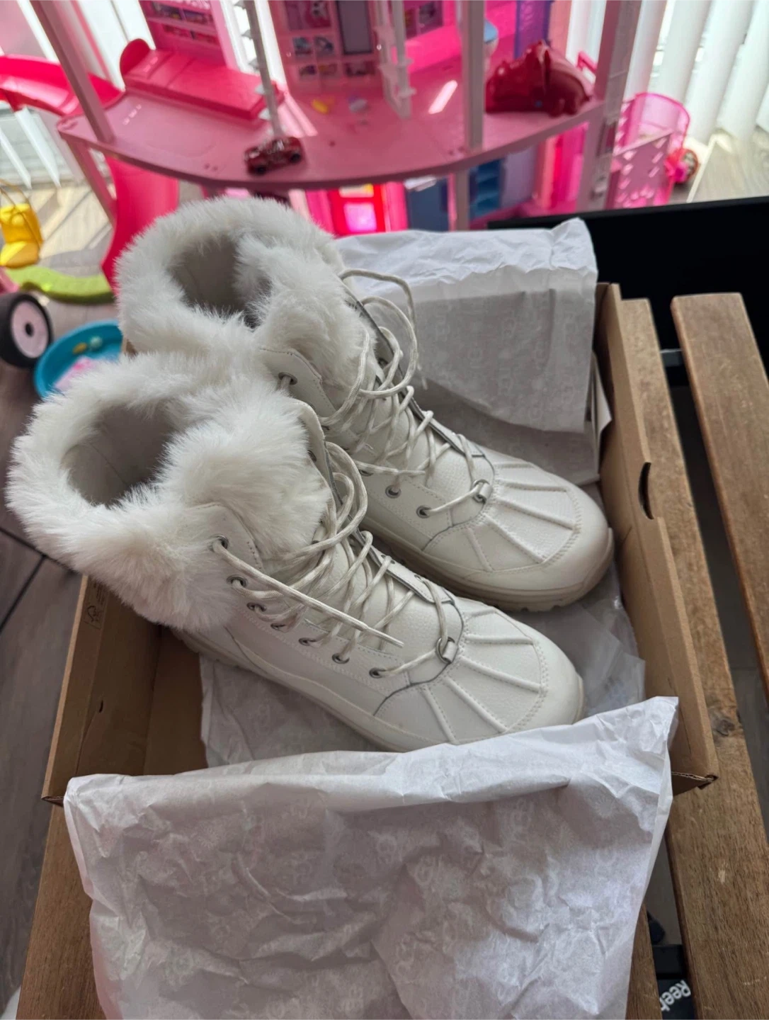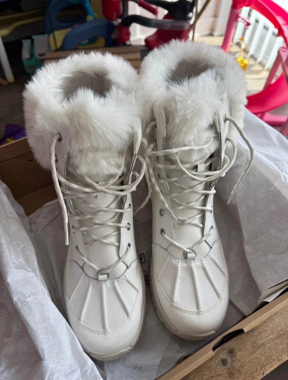 They are white and feature a cozy fur trim. The boots are in great condition and come with their original box. They are a size 10. Used only 1 time !!!