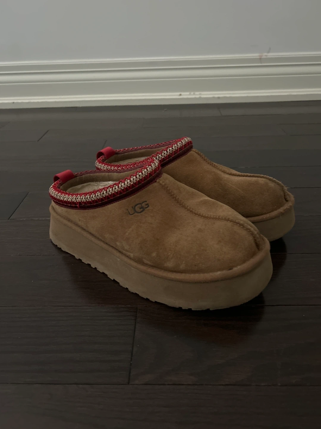 Cozy up with these UGG Tasman slippers! They're in great condition and perfect for keeping your feet warm and comfy around the house. These are a women's style slipper with a red and cream coloured trim.