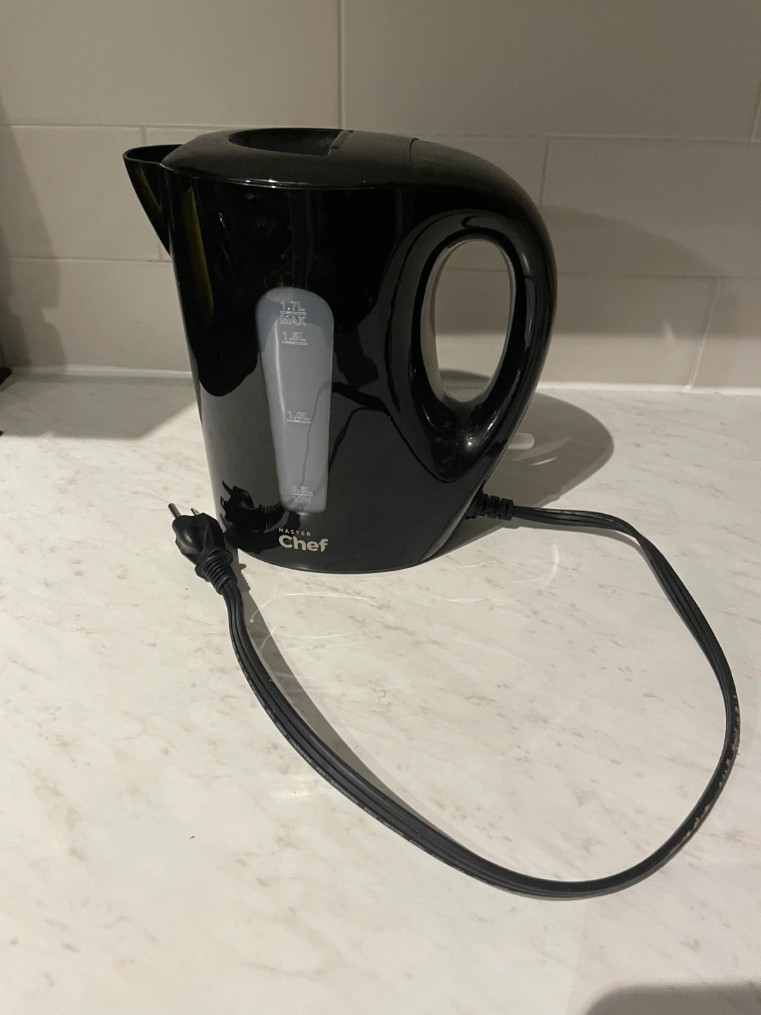 Master Chef electric kettle with a 1.7L capacity. Black plastic exterior. Has a water level indicator. Plugs into a standard outlet.