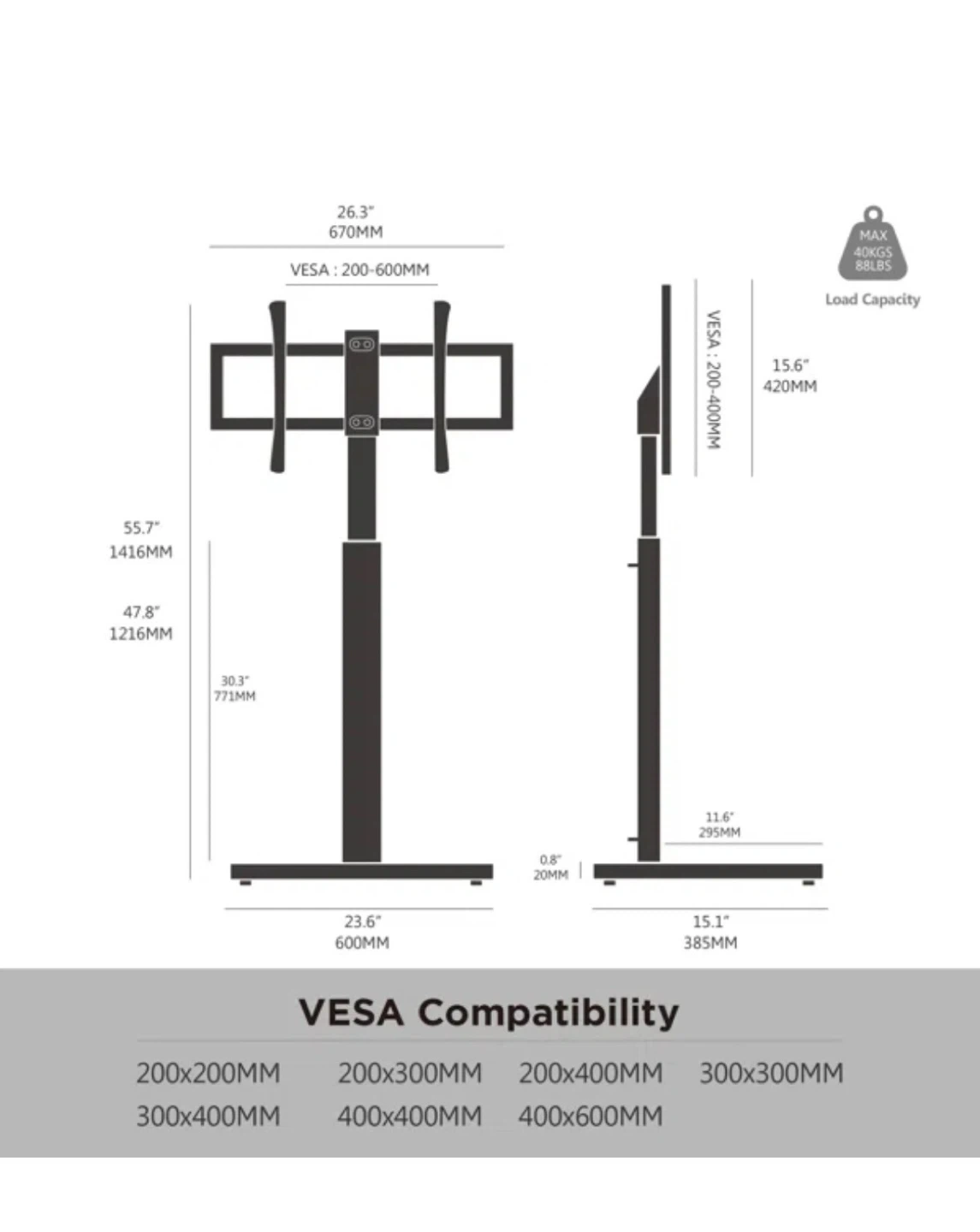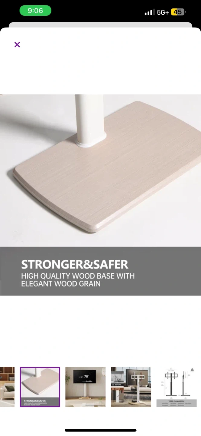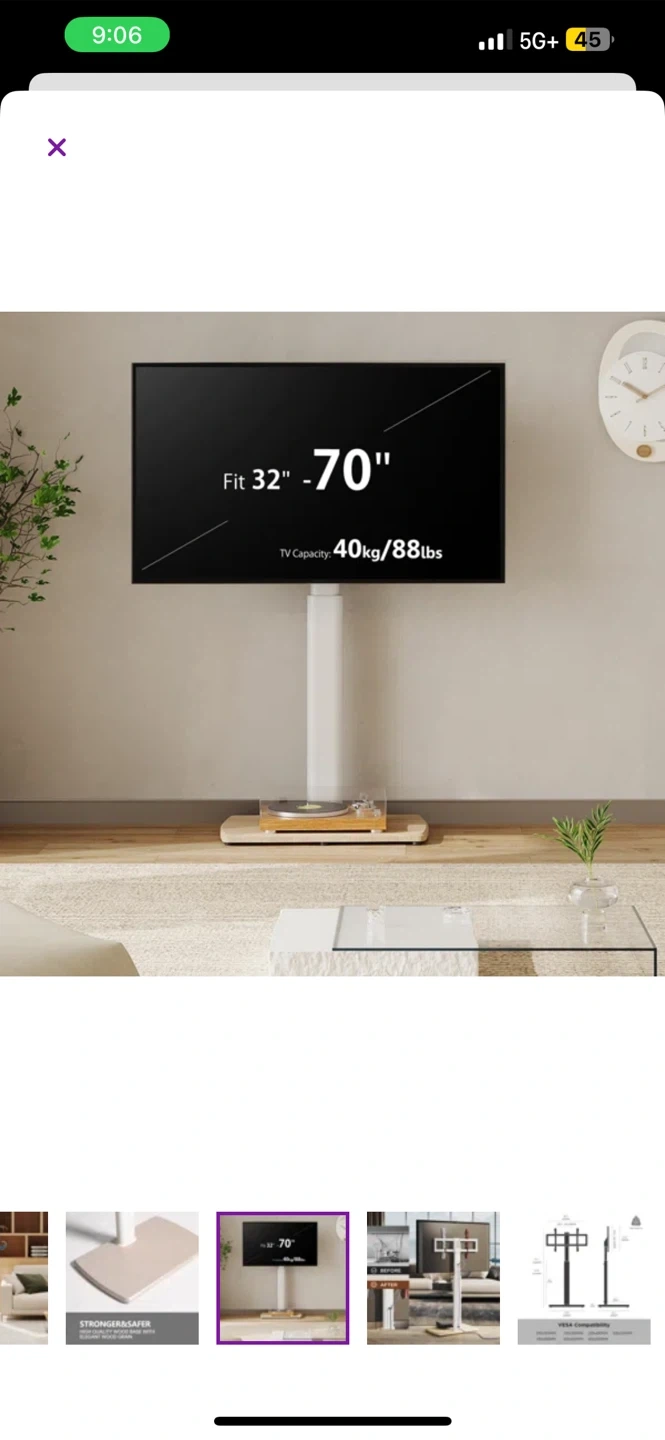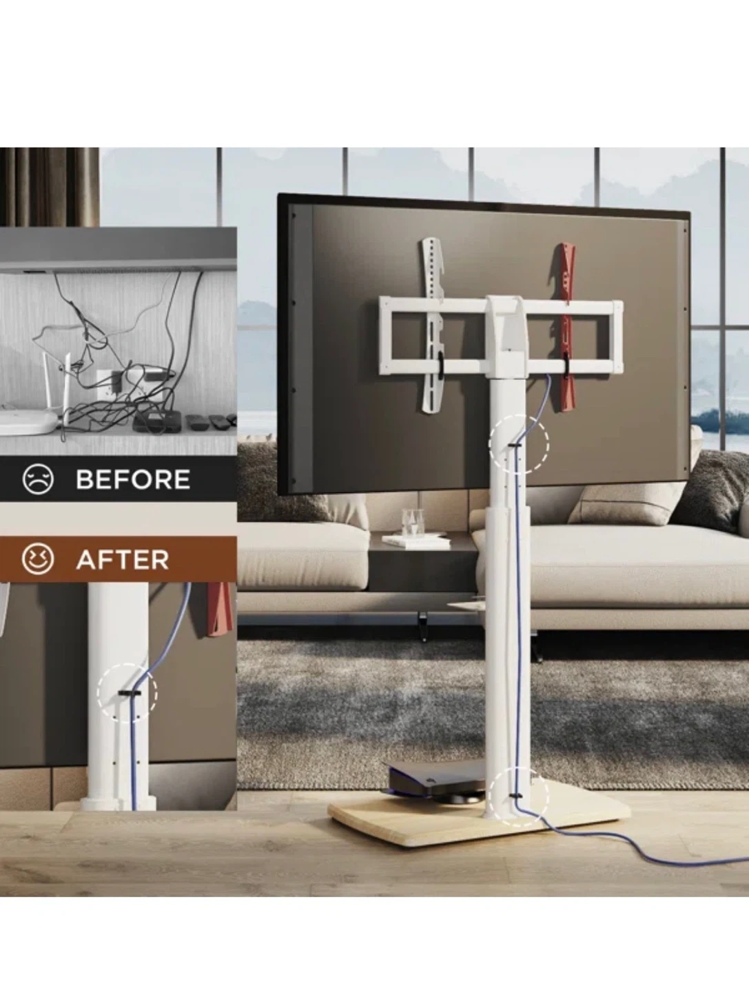 This TV stand fits TVs from 32" to 70" and supports up to 40kg/88lbs. It's height adjustable and swivels up to +/- 30 degrees. The base is made of high-quality wood with an elegant grain. It also includes cable management to keep things tidy!