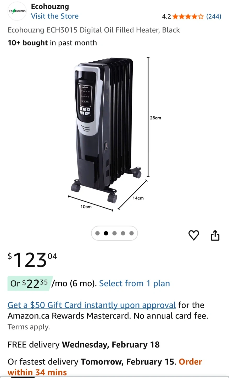 Ecohouzng ECH3015 digital oil-filled heater in black. It's 26cm high, 14cm deep, and 10cm wide. This heater is great for keeping small to medium rooms cozy during colder months.