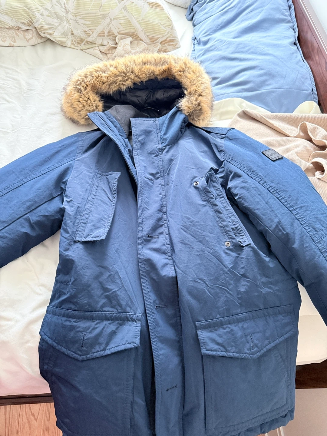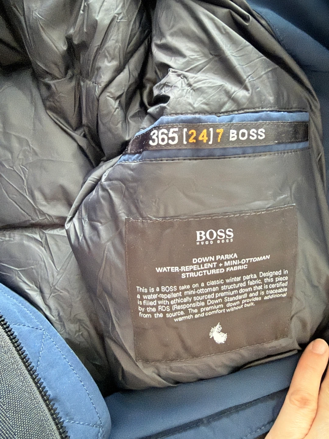 This is a BOSS down parka made with water-repellent, mini-ottoman structured fabric. It's filled with ethically sourced premium down. Designed for cold weather, it offers great warmth.