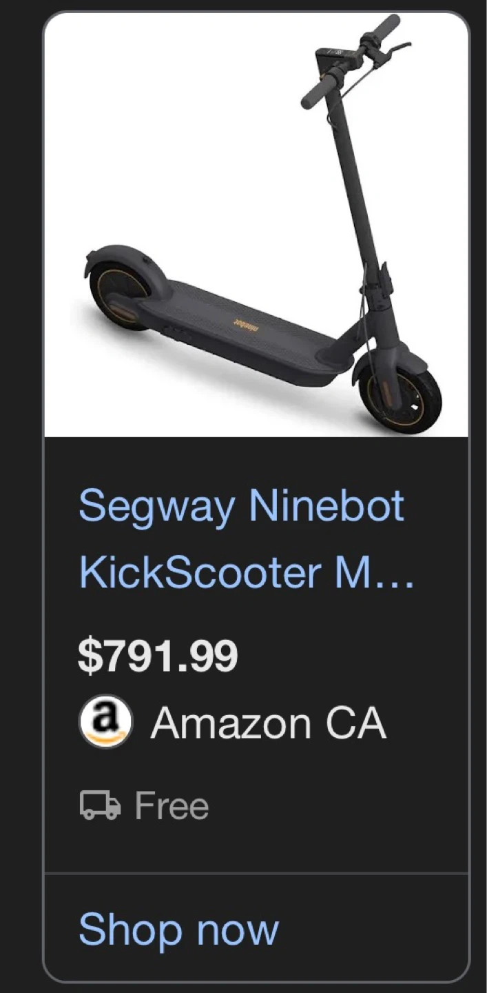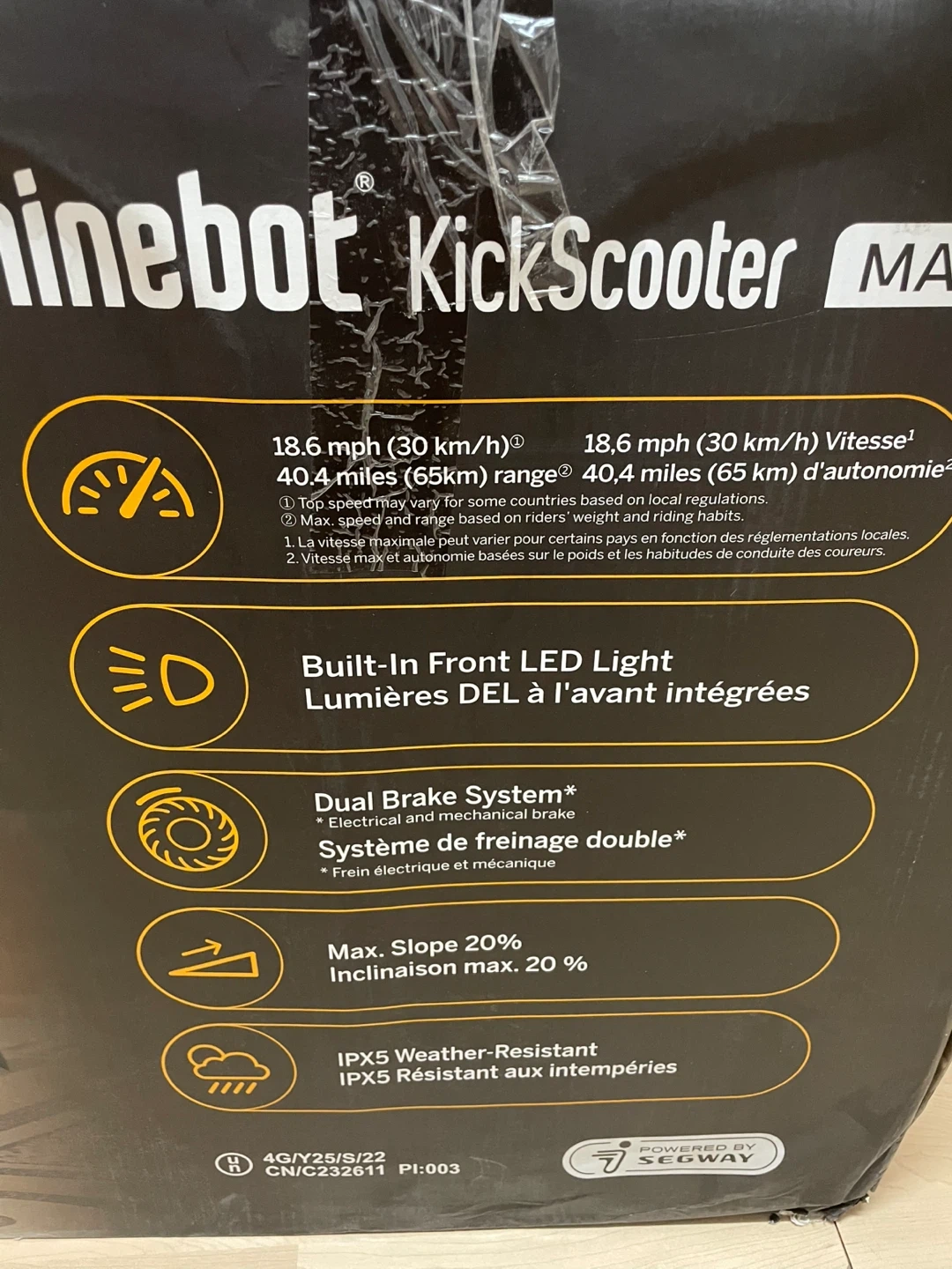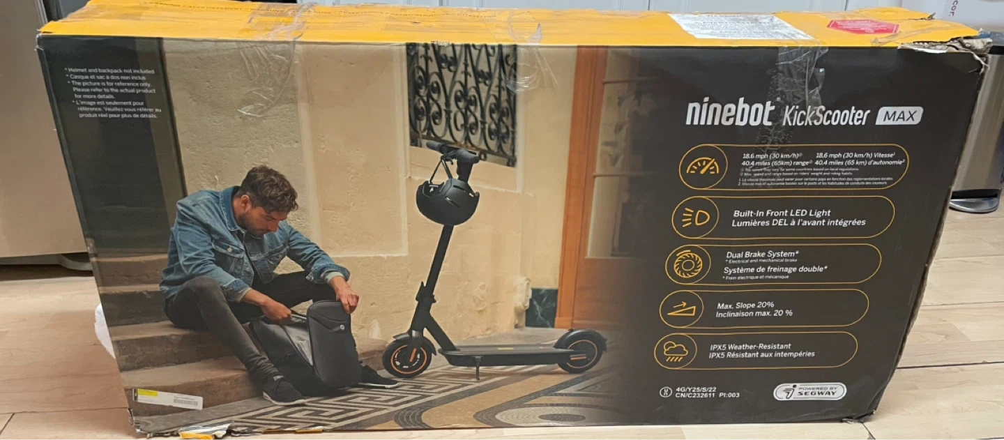 This electric kickscooter offers a top speed of 18.6 mph (30 km/h) and a range of 40.4 miles (65 km). It's equipped with a built-in front LED light and a dual brake system. The scooter is also IPX5 weather-resistant.