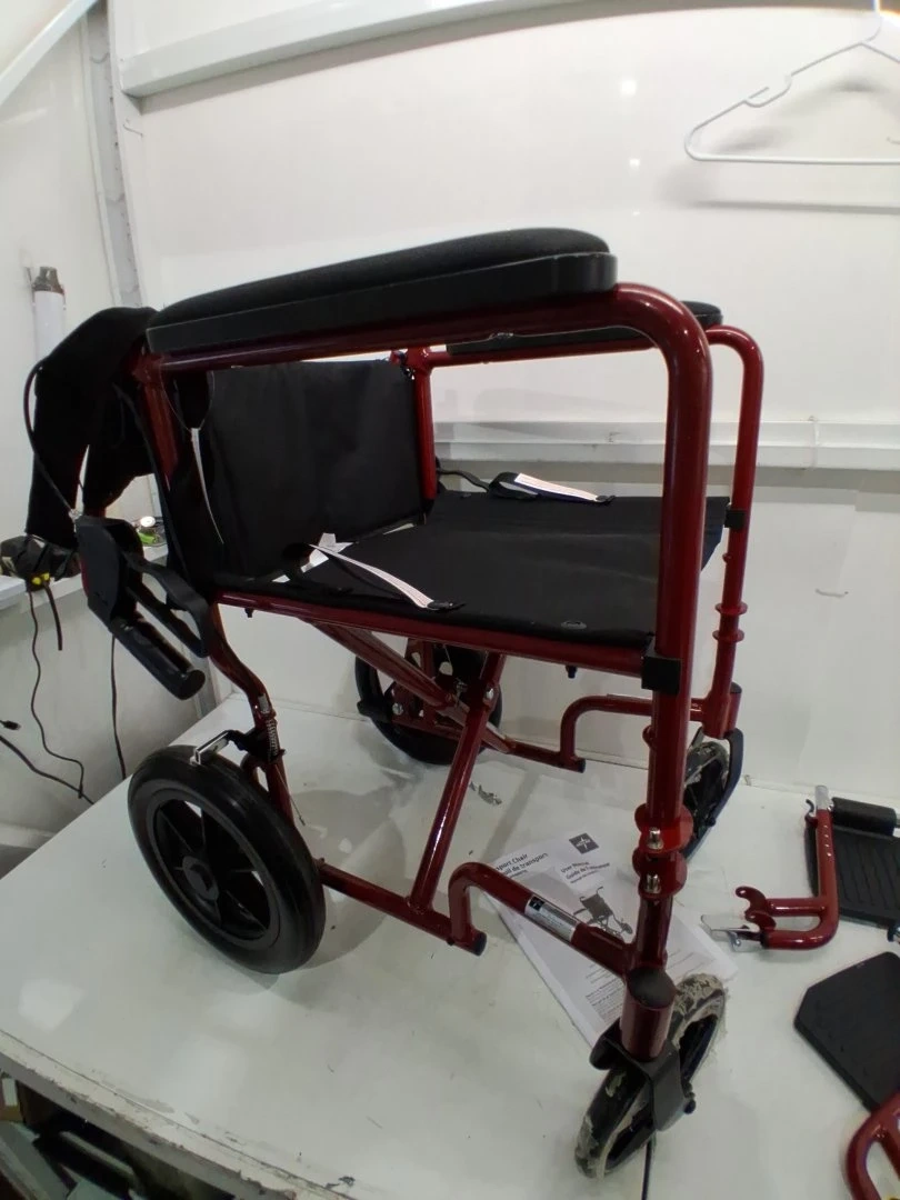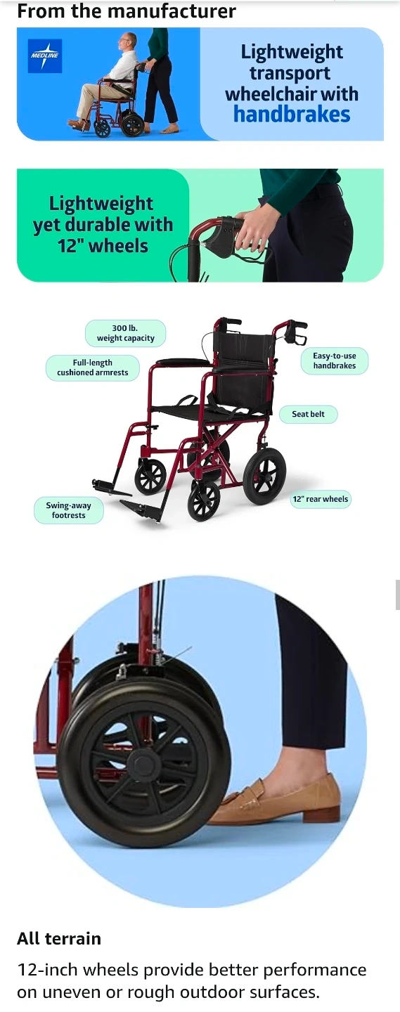 This is a Medline lightweight transport wheelchair, complete with handbrakes and folding capabilities, perfect for adults and featuring 12-inch wheels. π§βπ¦½π