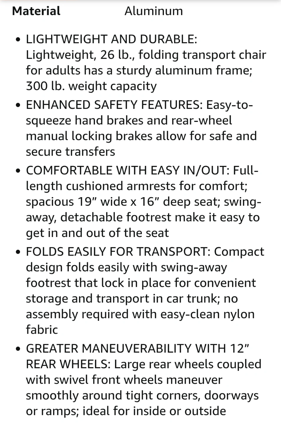 The sturdy aluminum frame supports up to 300 lbs, and it folds easily for transport and storage. The easy-to-squeeze handbrakes ensure safety, while the comfortable armrests and swing-away footrests add to the user experience. π‘οΈπ