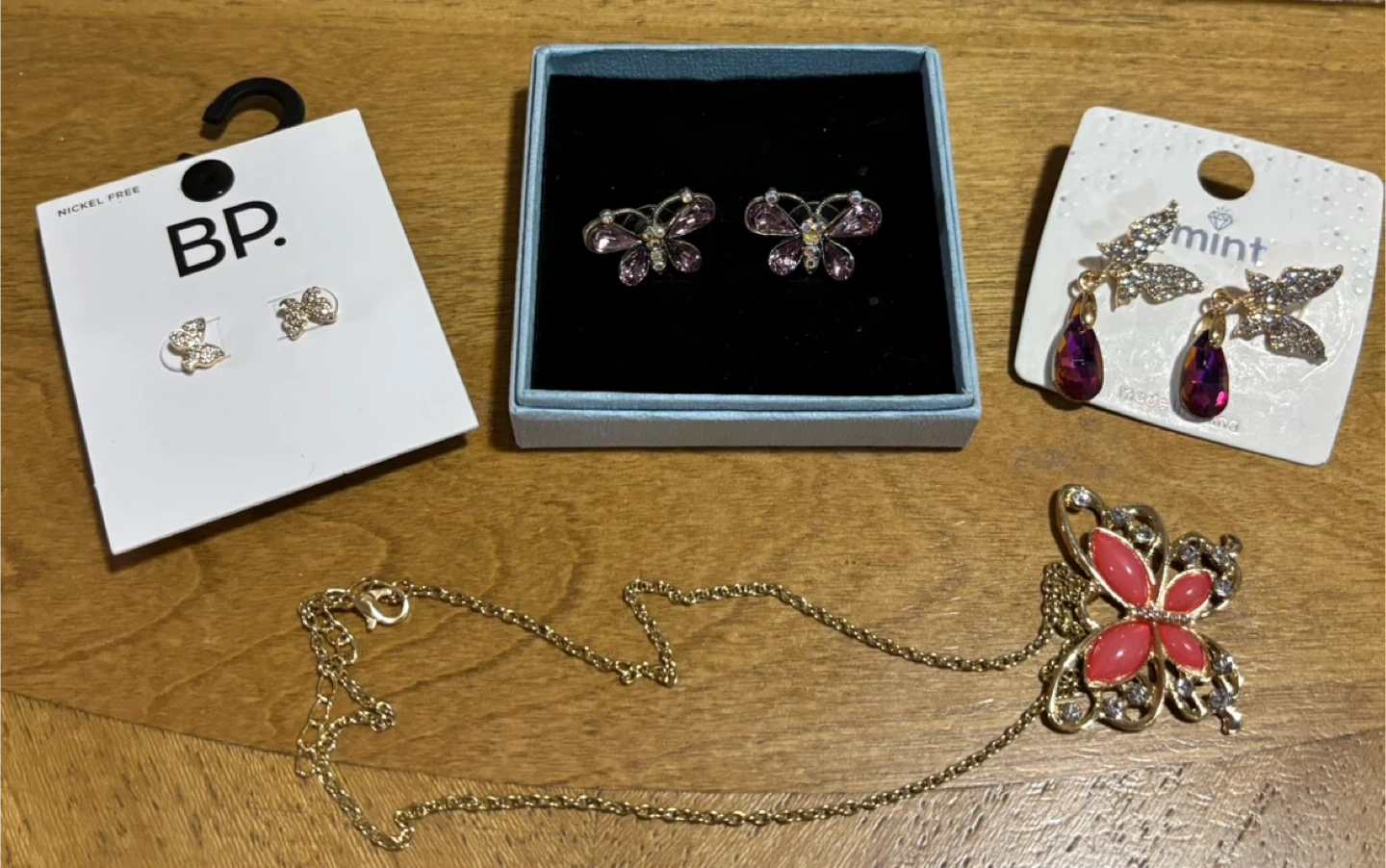 Selling a cute collection of butterfly-themed jewelry! There's a pair of BP. stud earrings, butterfly earrings in a box, and mint butterfly earrings with purple drops. Plus, a lovely gold-tone necklace.