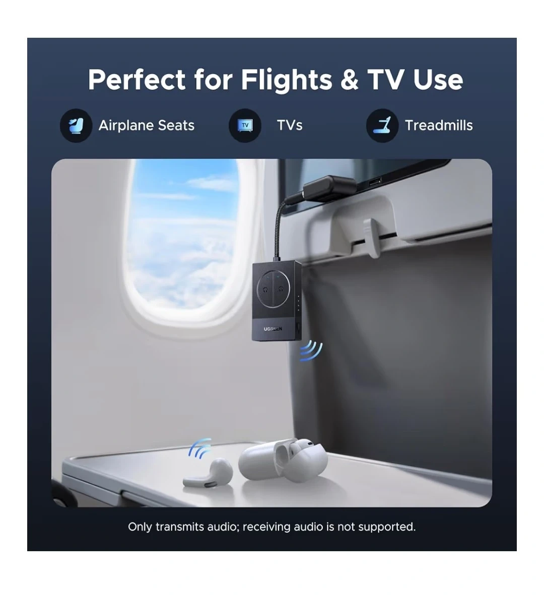 26Brand new in Box This adapter features simple, intuitive dual pairing, allowing you to connect two devices with separate buttons and individual LED indicators for clear status. It's perfect for flights and TV use, supporting airplane seats, TVs, and treadmills. Enjoy stable Bluetooth 5.4 with fast transfer, low latency, and a wider range.