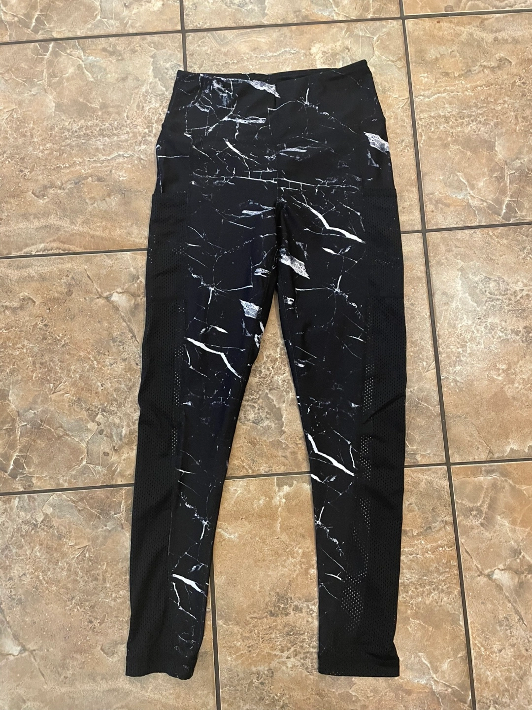Women’s Infinite Performance black marble leggings, with side pockets and mesh panels on the sides.