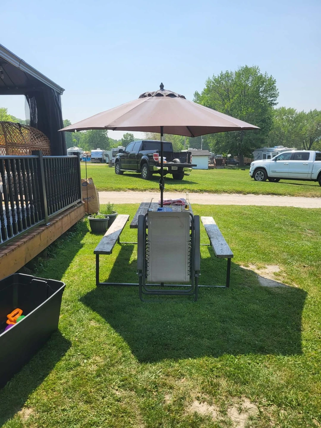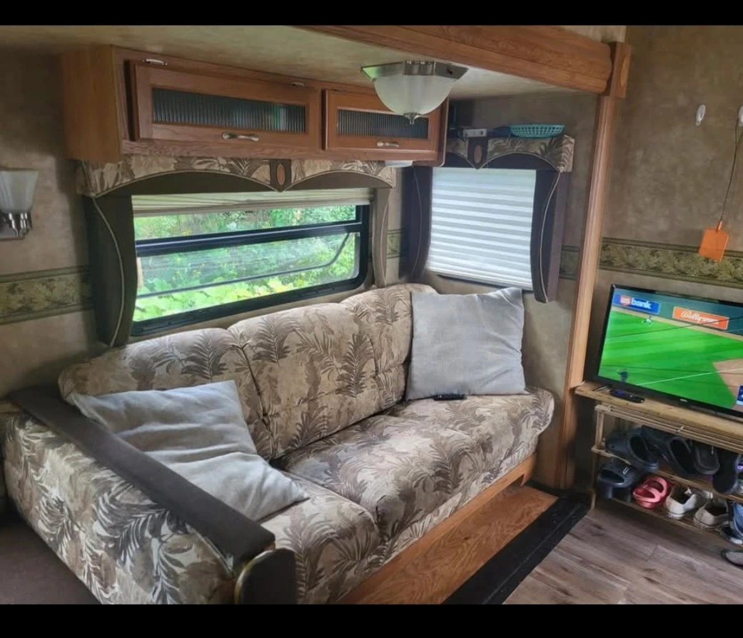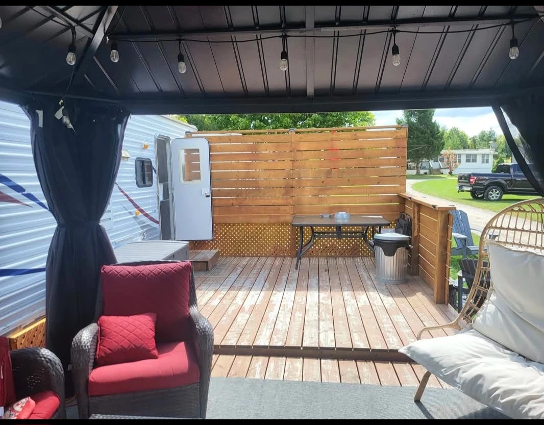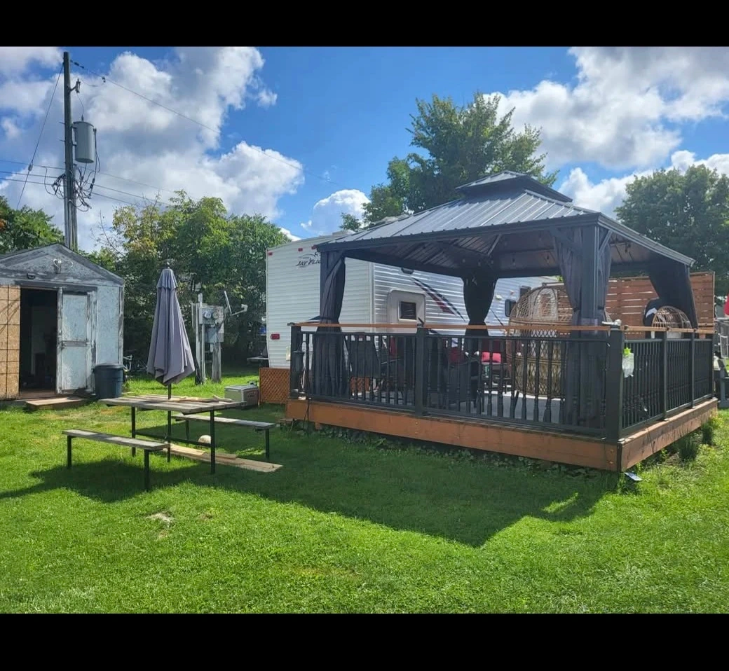 Located at Smith Trailer Park and Camp in Midland, ON, this trailer is perfect for large families or groups of friends. It sleeps up to 10 people, with a queen-sized bed in the main bedroom and two bunk beds in the back bedroom. The living room features a pull-out couch and a table that converts into a bed. The trailer also has a full bathroom with a tub. The lot is a double lot with a large field in front, offering plenty of space to relax and enjoy the outdoors. The trailer comes with a deck, perfect for barbecues and outdoor dining. Additional features include a full-size fridge in the shed and a tin boat with a 3hp motor. Note: The gazebo was unfortunately damaged during the winter, and has since been taken down