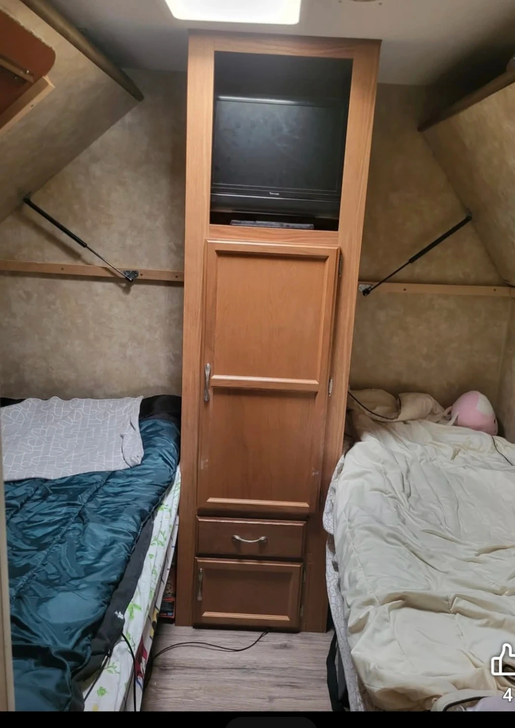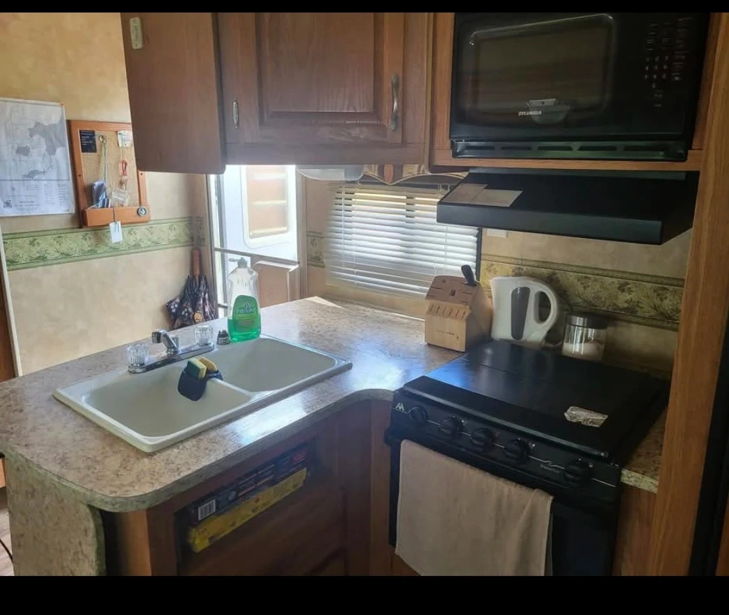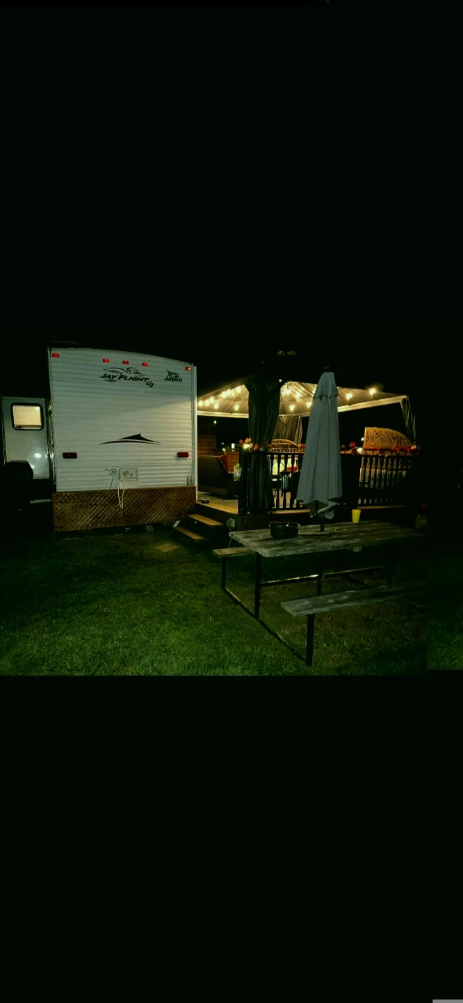 Located at Smith Trailer Park and Camp in Midland, ON, this trailer is perfect for large families or groups of friends. It sleeps up to 10 people, with a queen-sized bed in the main bedroom and two bunk beds in the back bedroom. The living room features a pull-out couch and a table that converts into a bed. The trailer also has a full bathroom with a tub. The lot is a double lot with a large field in front, offering plenty of space to relax and enjoy the outdoors. The trailer comes with a deck, perfect for barbecues and outdoor dining. Additional features include a full-size fridge in the shed and a tin boat with a 3hp motor. Note: The gazebo was unfortunately damaged during the winter, and has since been taken down