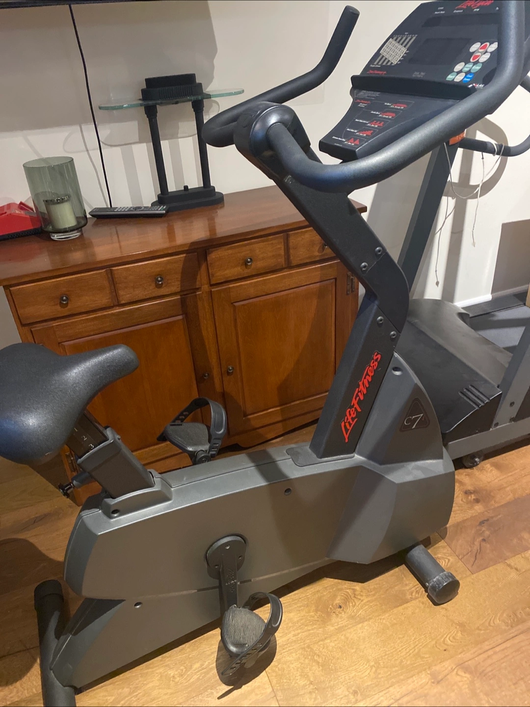 Excellent condition upright exercise bike. Features various workout programs and heart rate monitoring. Durable construction. Great for home workouts.
