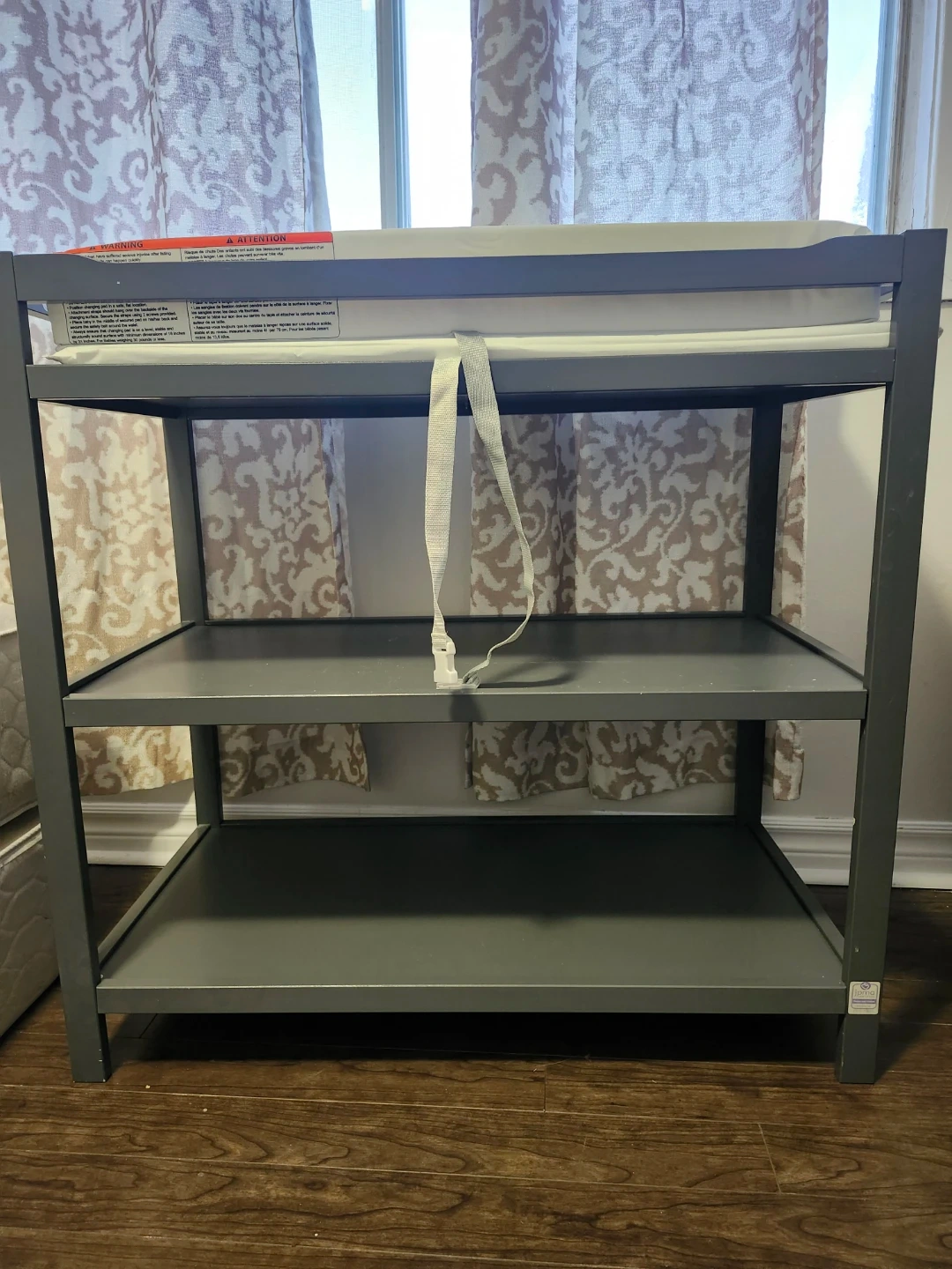 This set includes a grey baby crib and changing station with multiple shelves and a matching grey dresser with six drawers. Both pieces are made of wood and have a neutral grey finish. The changing station has a safety strap for securing your baby. Mattress included
