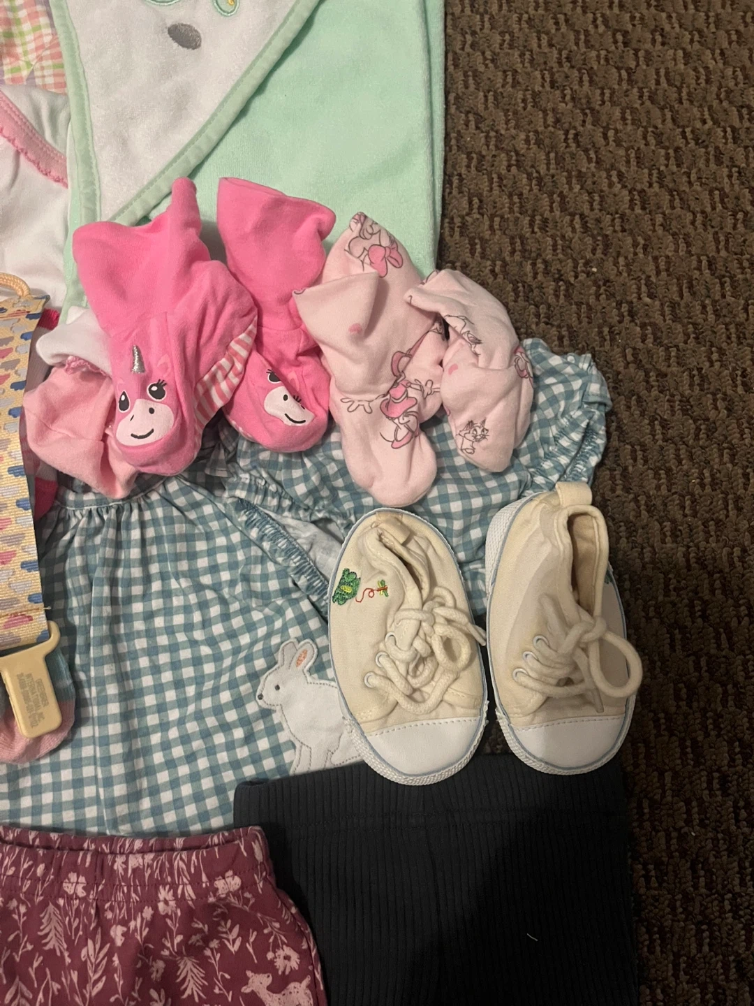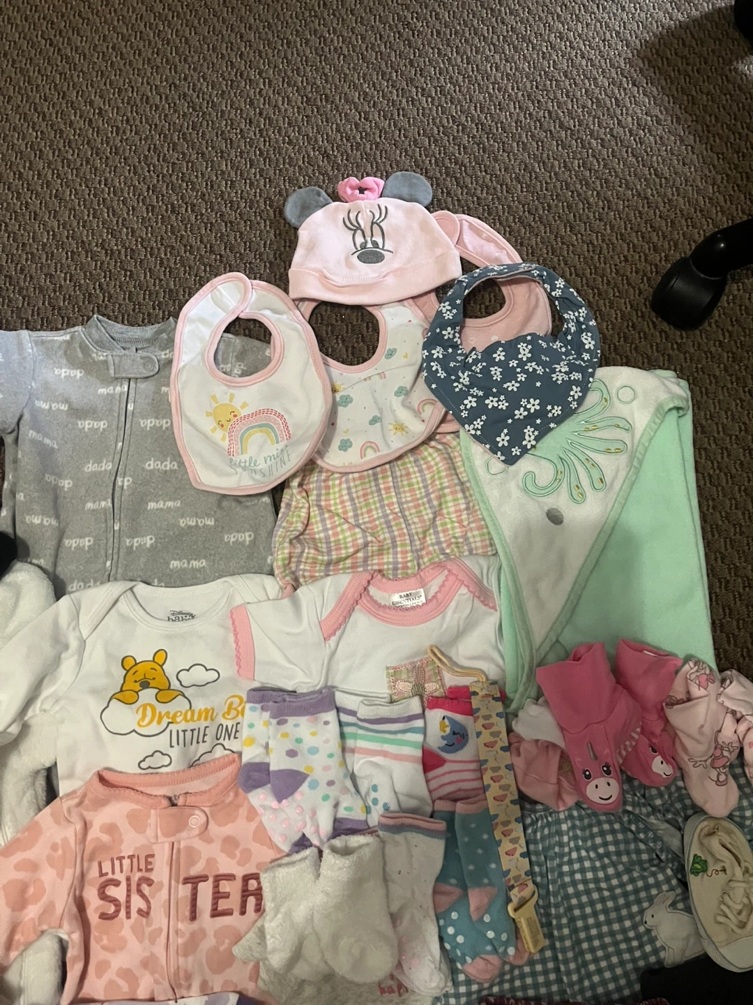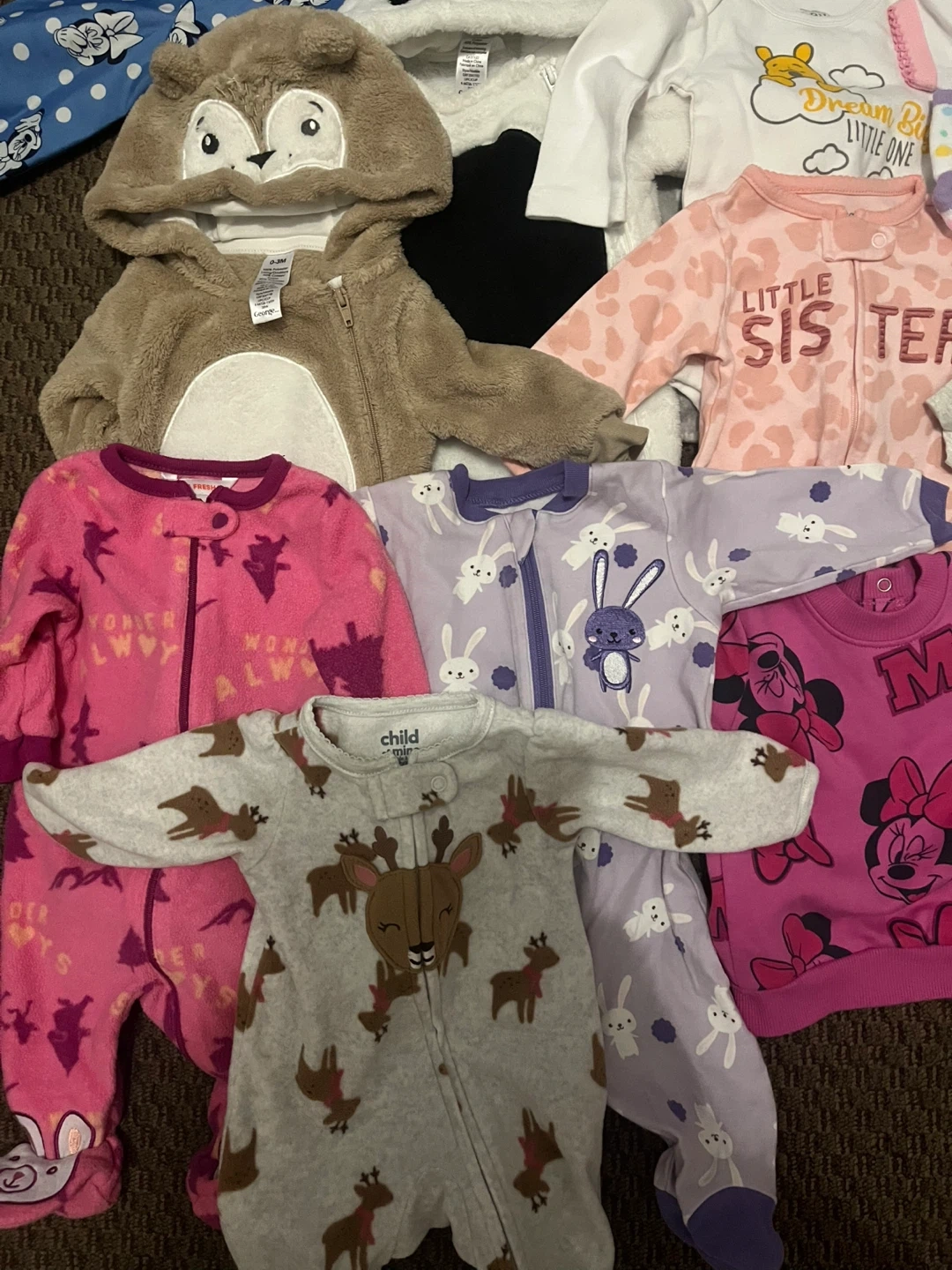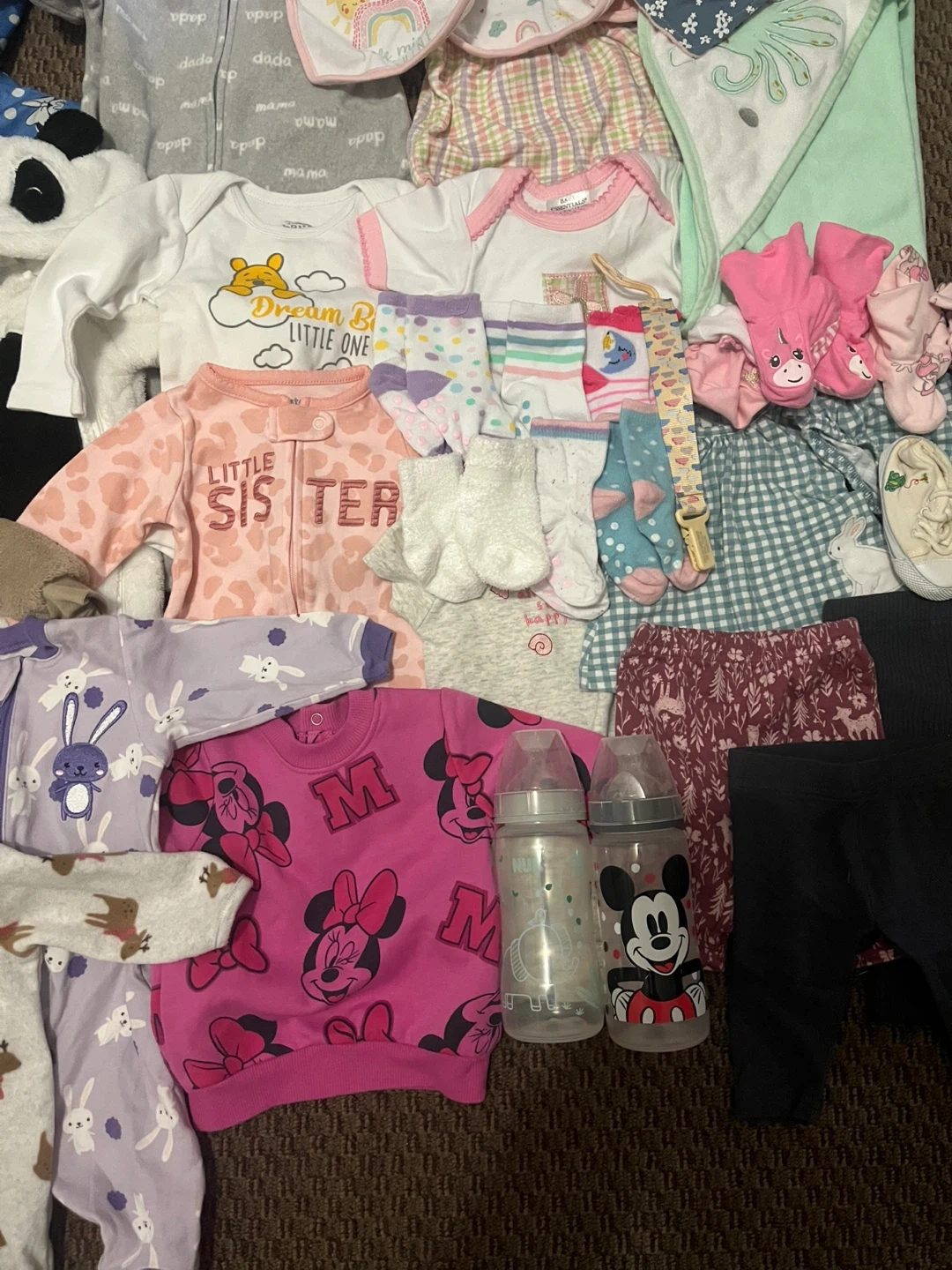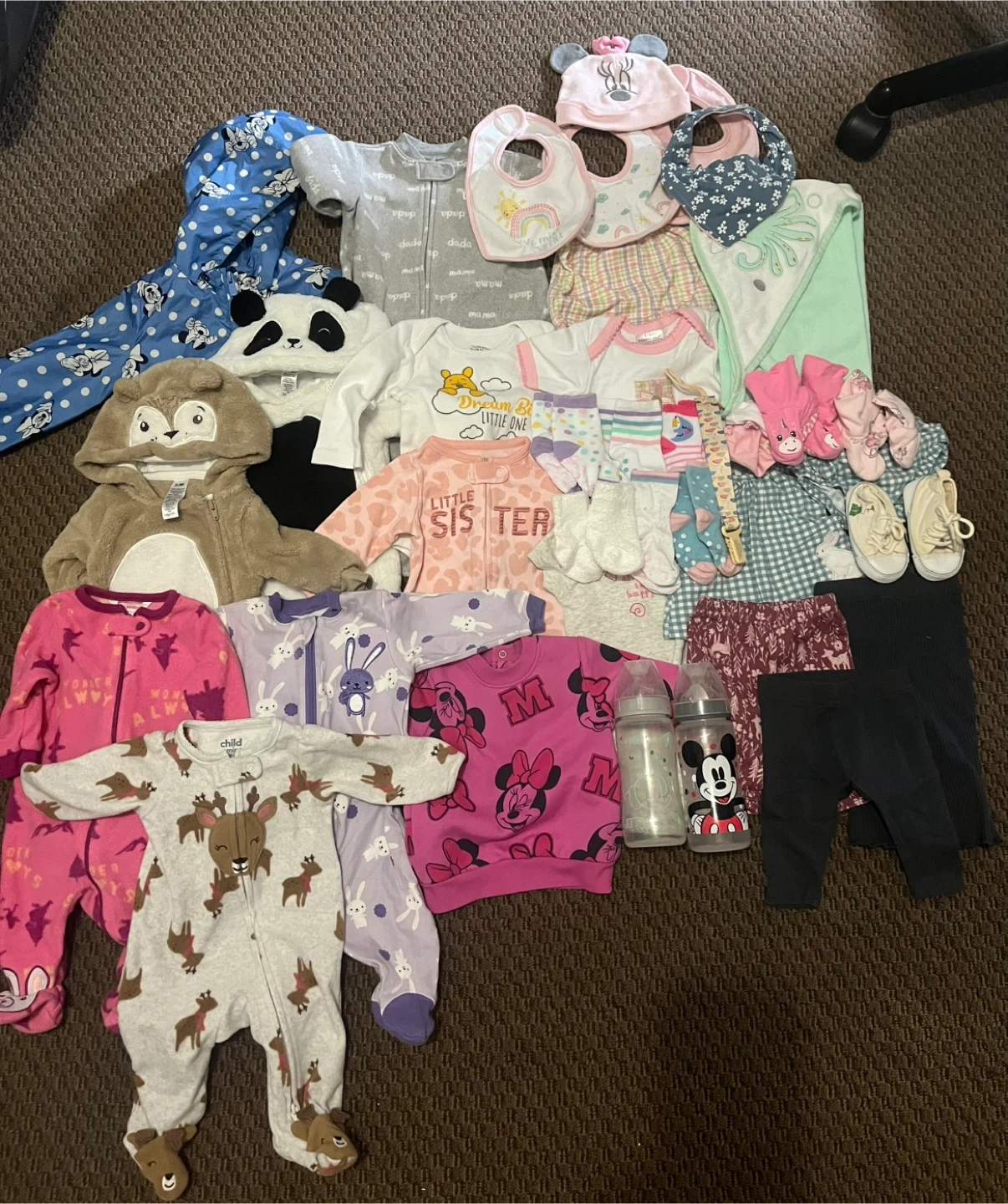 This is a bundle of baby girl clothes featuring Disney characters like Minnie Mouse and Winnie the Pooh. It includes a onesie, footie pajamas, pants, a jacket, a hat, bibs, socks and 2 bottles and many more Great for everyday wear or as a gift!