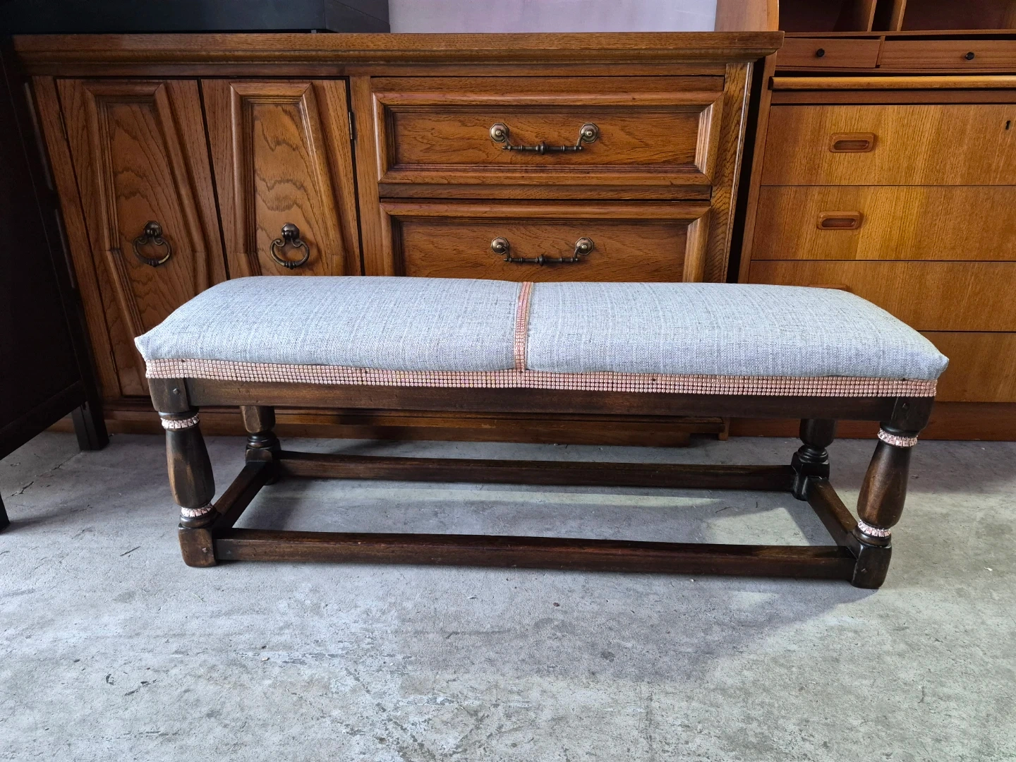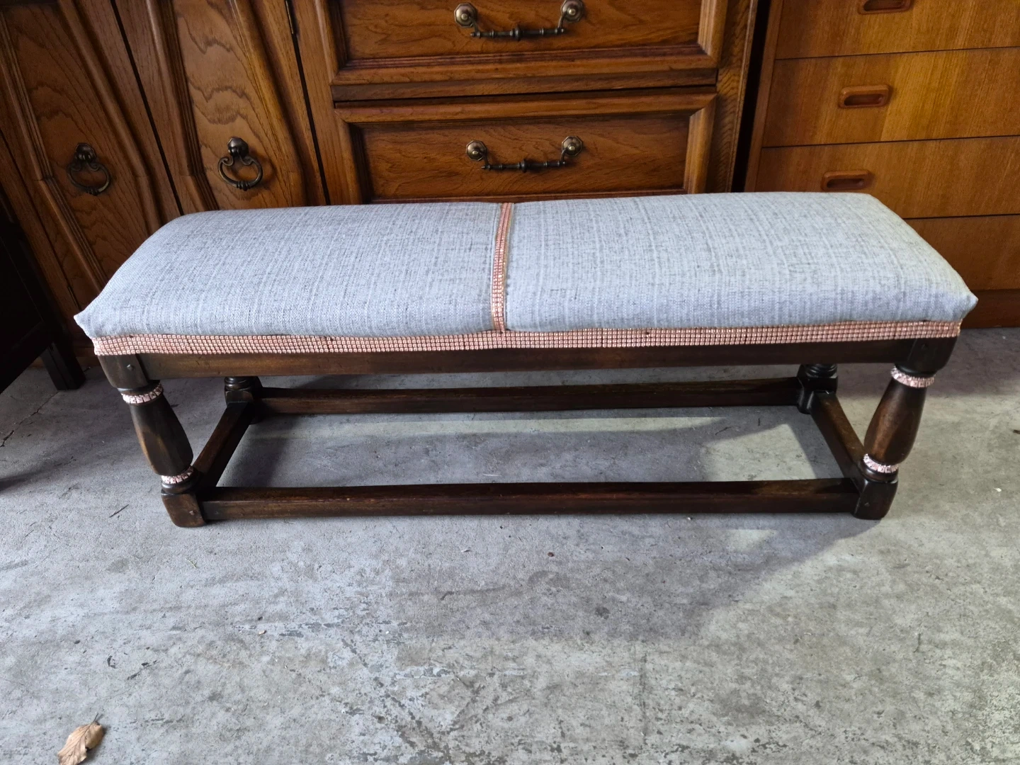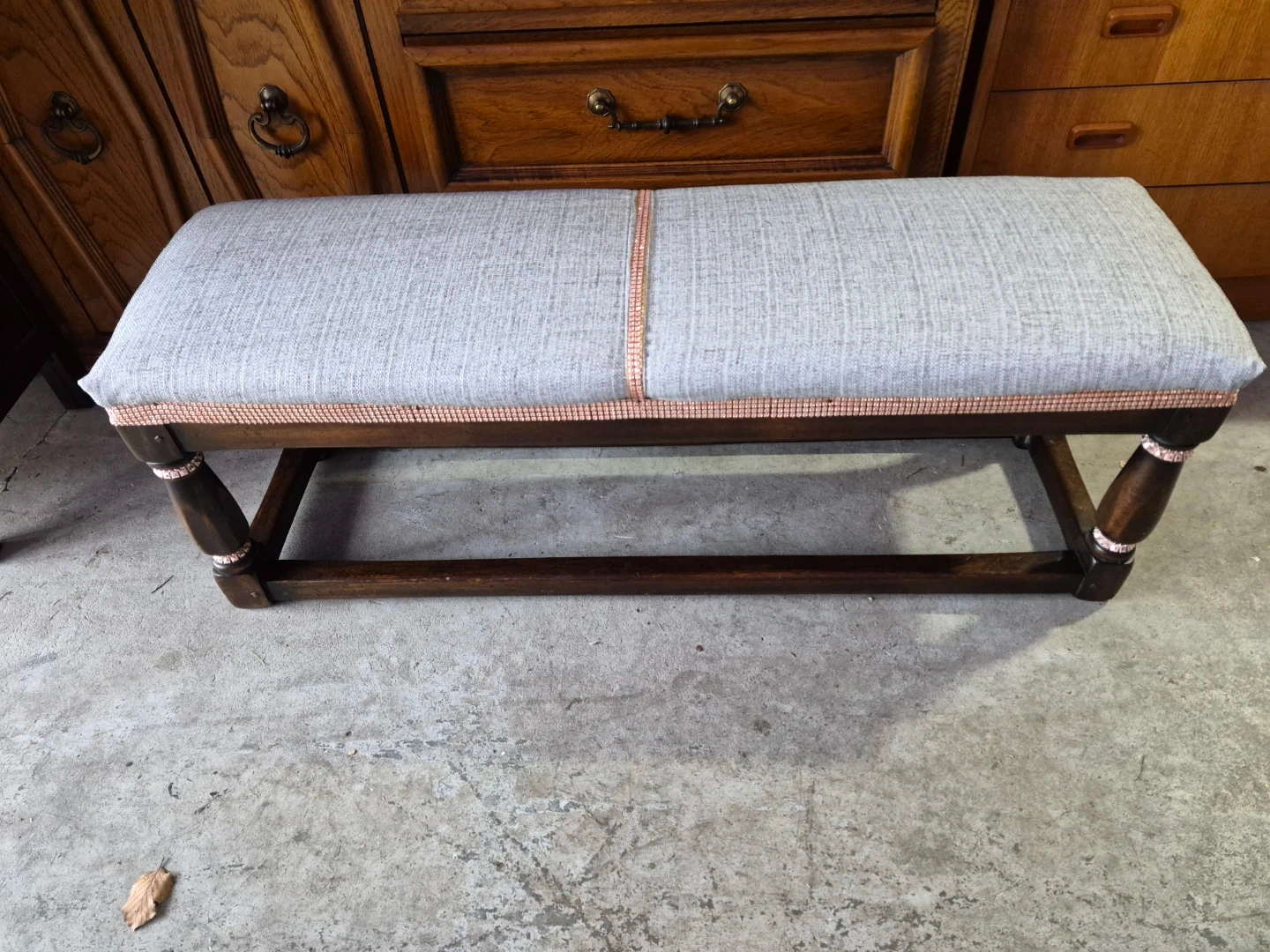 This upholstered bench features a grey woven fabric seat and dark wooden legs. It's accented with a decorative pink trim along the seat edge and on the legs. This bench offers a nice spot to sit or can be used as a decorative piece.