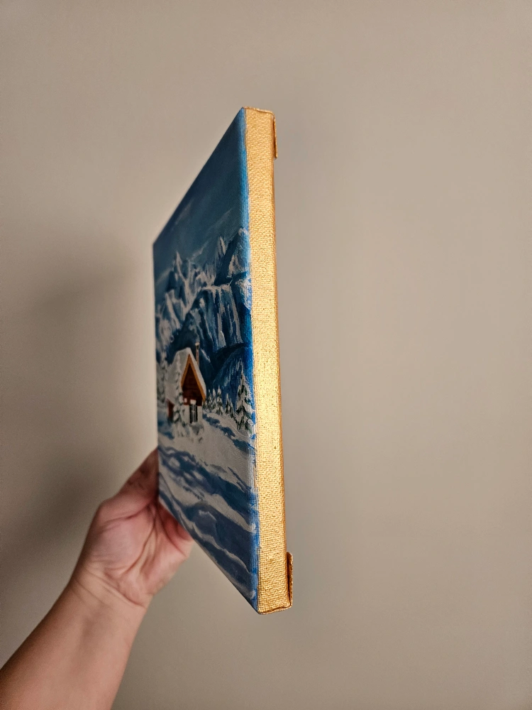 Small canvas painting. Depicts a snowy mountain scene with a small cabin. Gold painted edges. Minor imperfections visible.