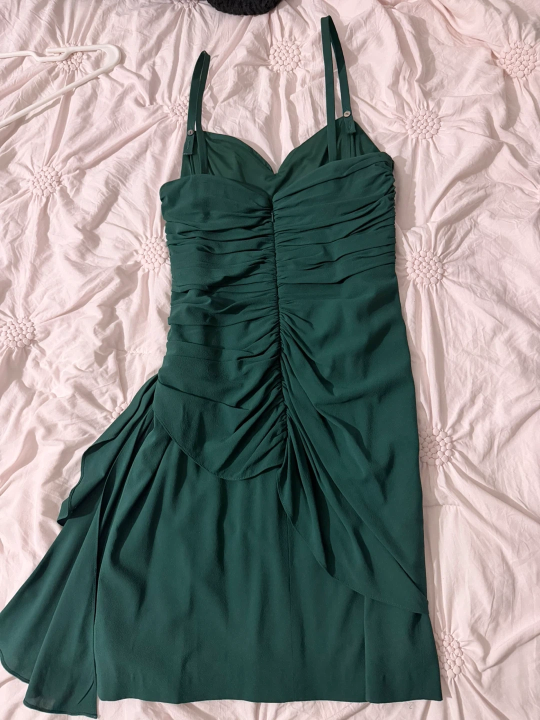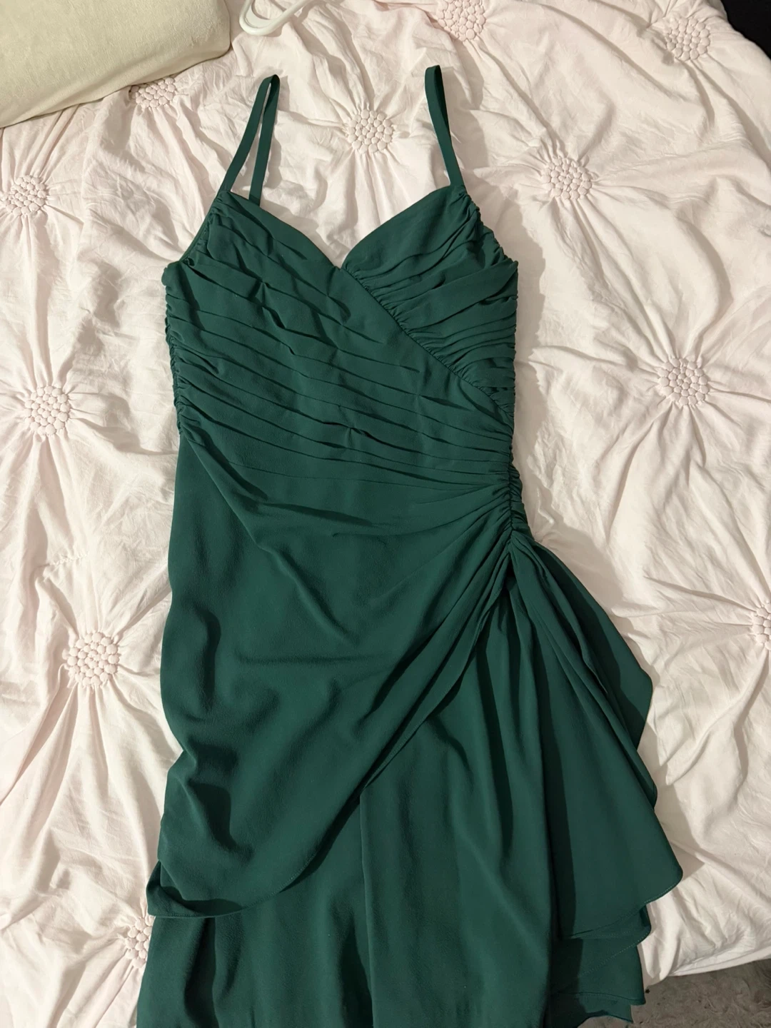 Beautiful green dress by Twelfth street by Cynthia Vincent. It features a flattering ruched design with adjustable spaghetti straps. This dress is perfect for a special occasion!
