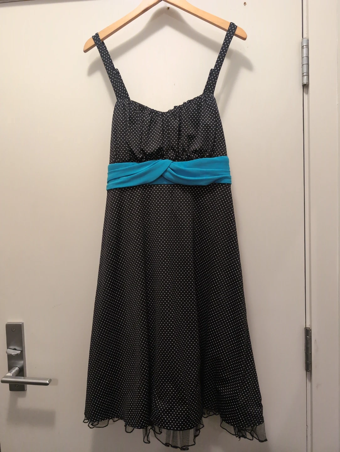 Black dress with white polka dots and a turquoise ribbon accent. It's a size 1X. Features ruffled trim at the hem.