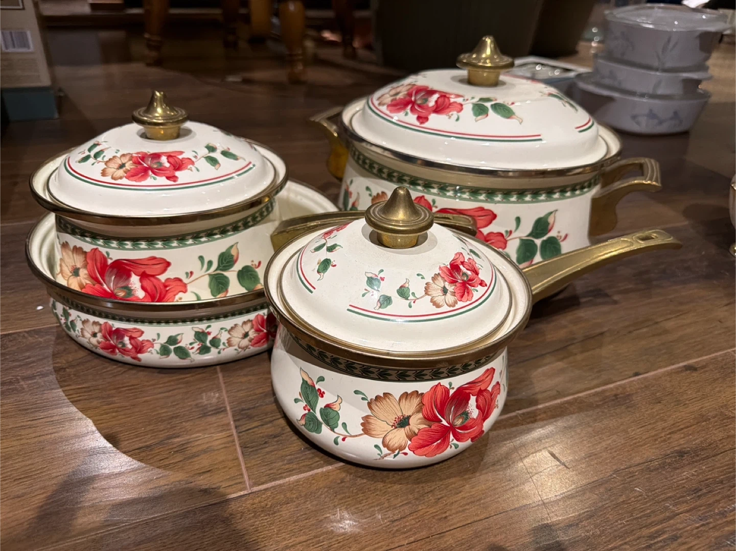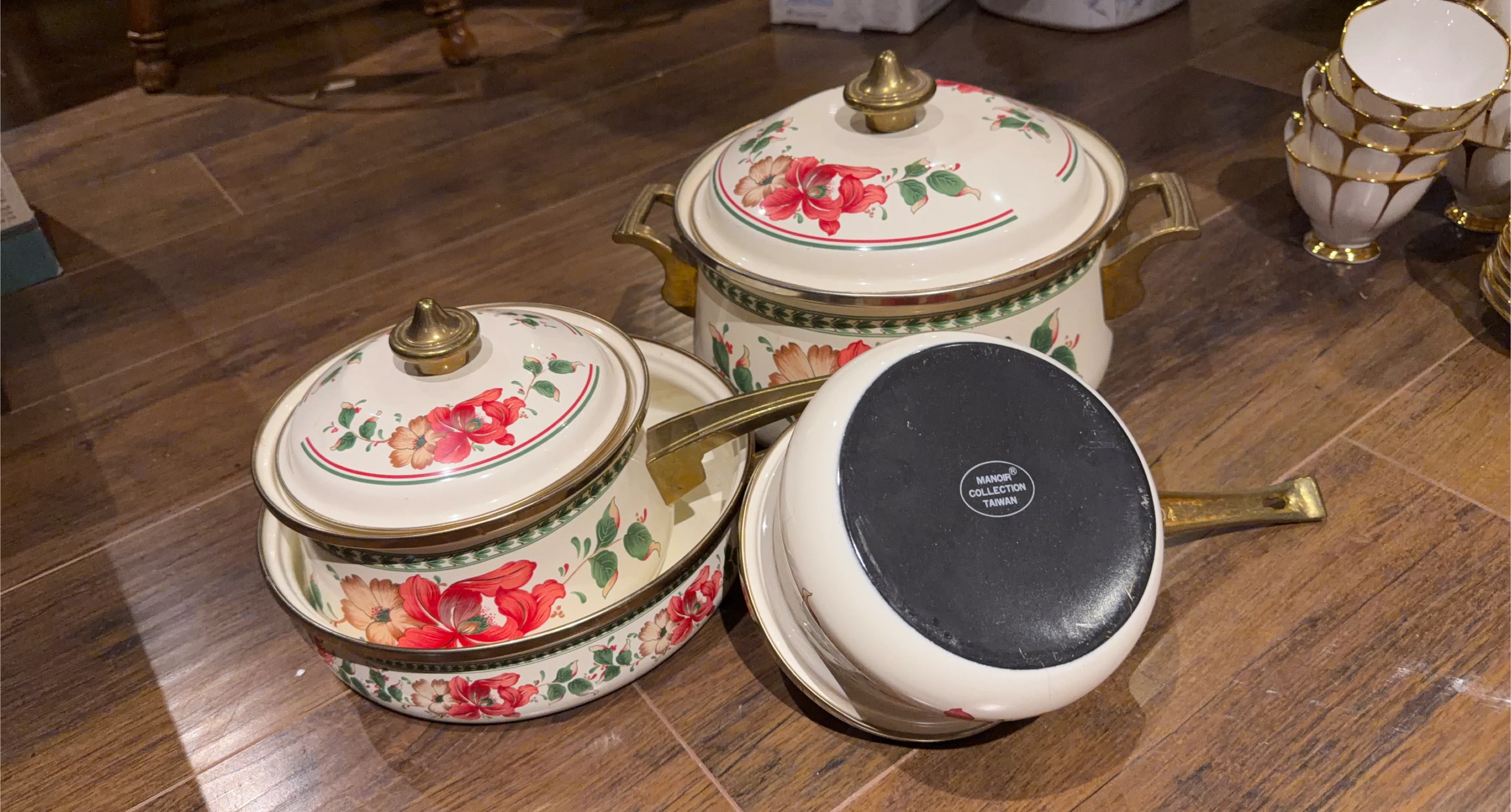 Selling a vintage Manoir Collection cookware set! This set features a lovely floral design and gold-tone handles. Perfect for adding a touch of retro charm to your kitchen. The set includes a saucepan, 2 smaller pots, and a larger pot with lids. Great condition!