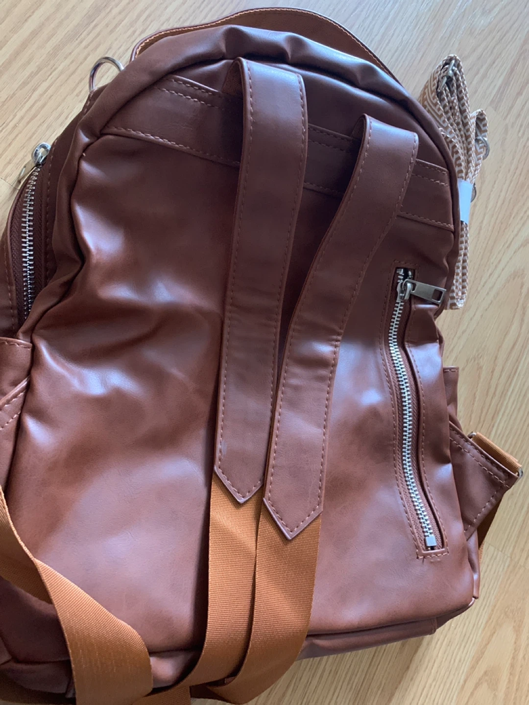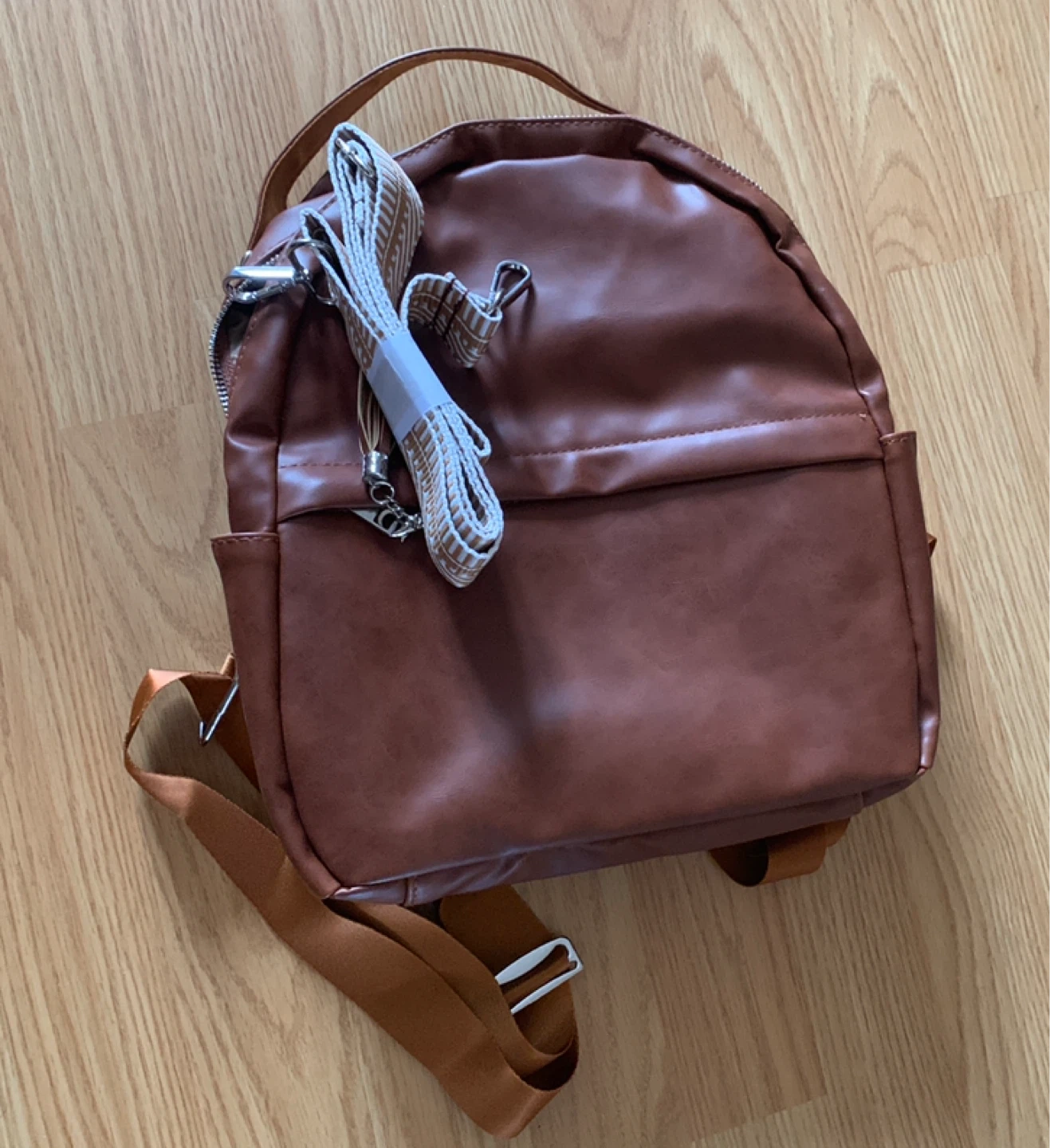 This mini backpack is made of faux leather in a rich brown colour. It features a main compartment with an interior zip pocket and a front zip pocket. It comes with adjustable shoulder straps and an extra decorative strap, Brand New