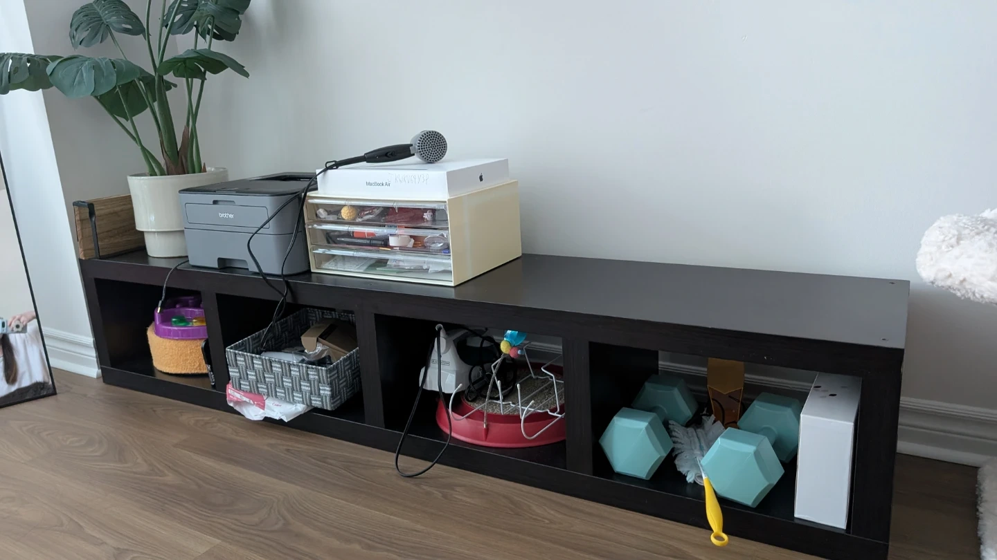 This is a long, black storage shelf unit. It has multiple cube compartments for organization. Can be placed horizontally or vertically.