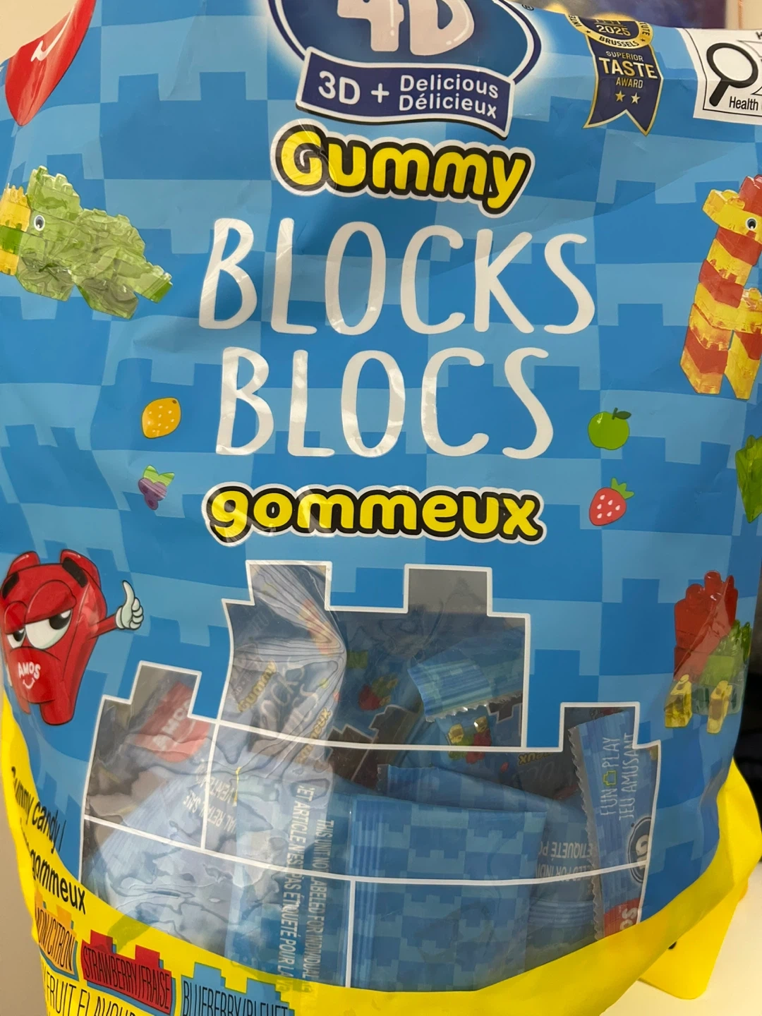 These Gummy Blocks are shaped like building blocks. They have won a Superior Taste Award in Brussels in 2025. The packaging mentions fruit flavors like strawberry and blueberry.