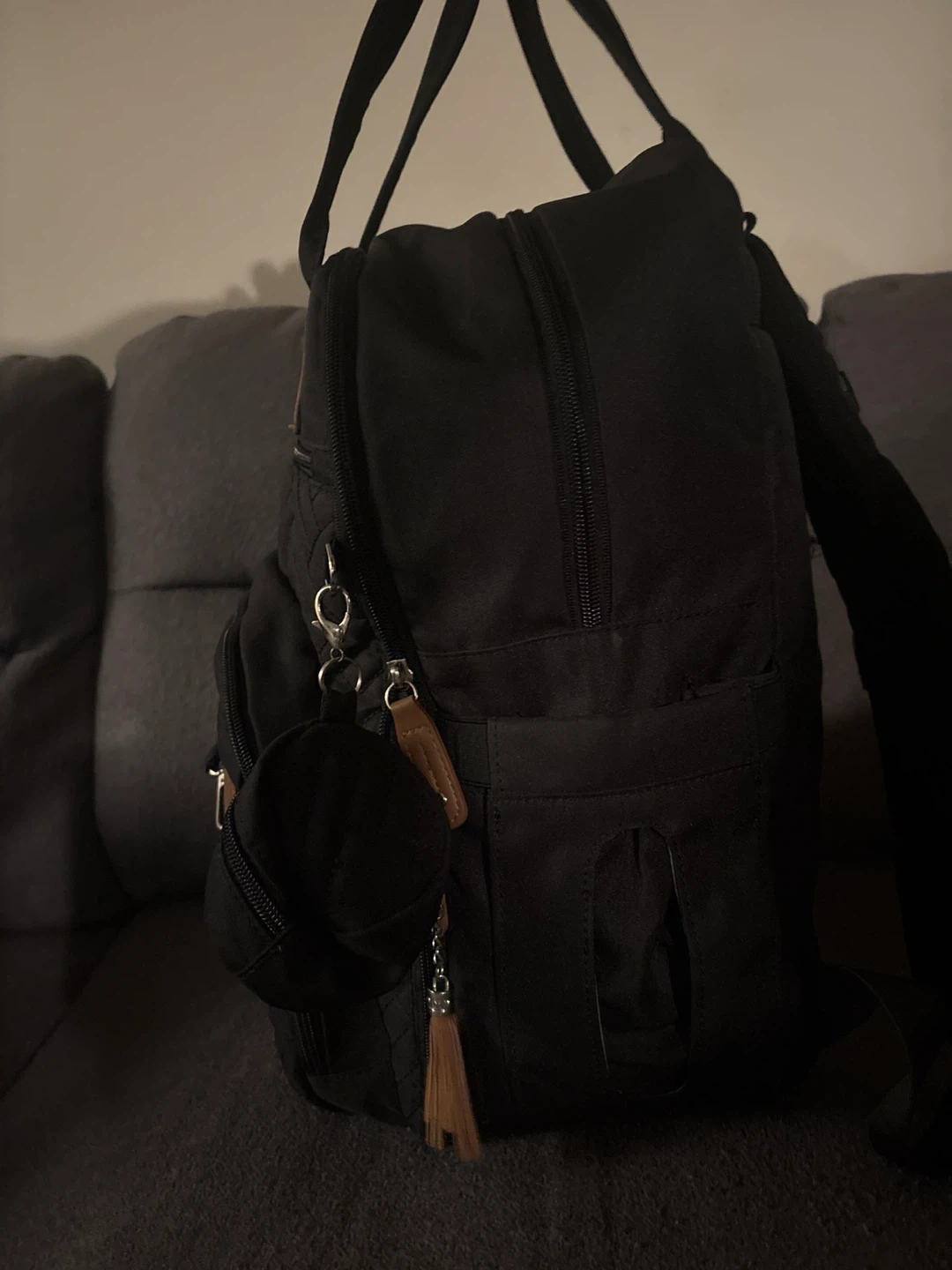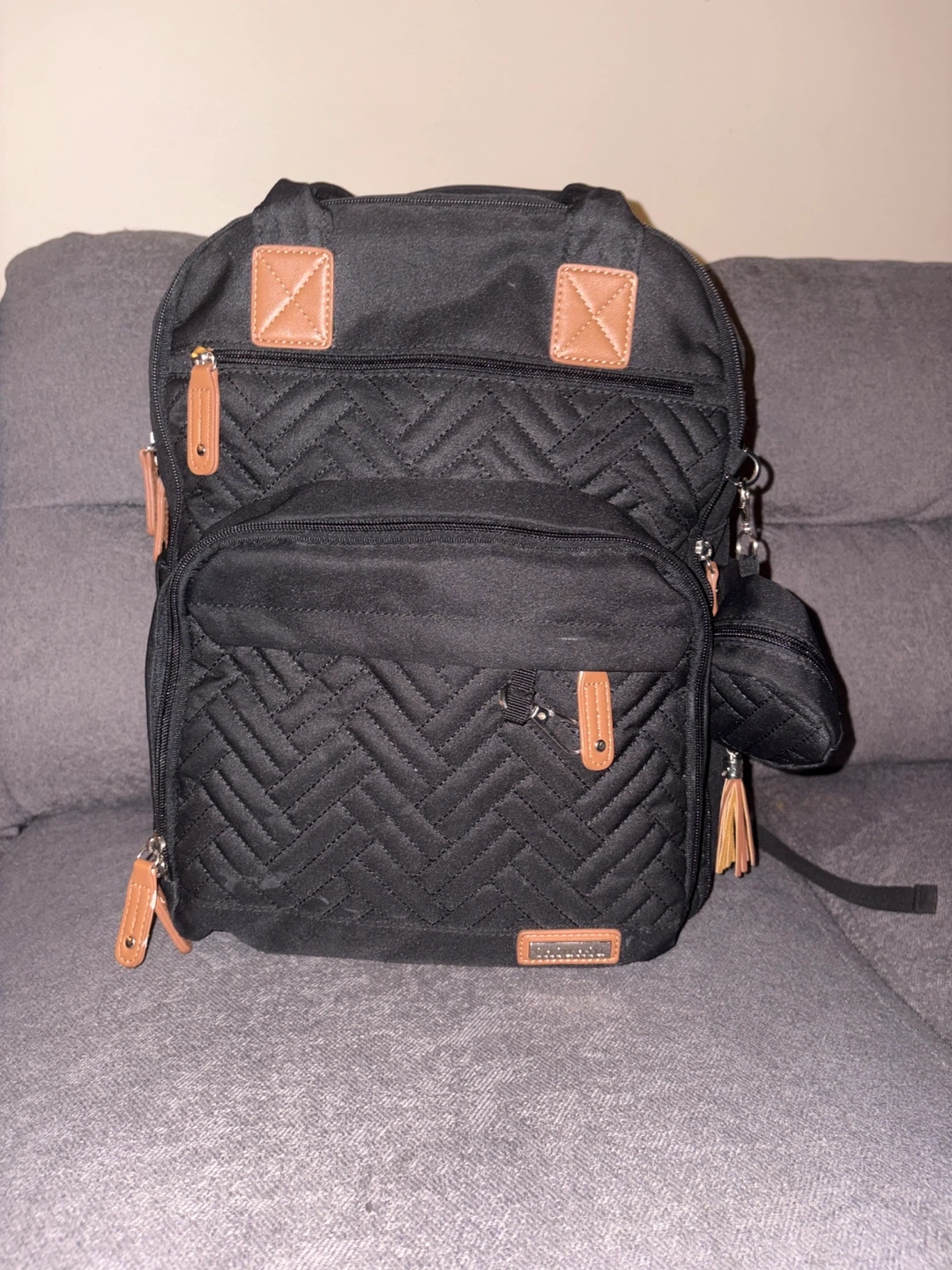 This black quilted backpack is designed for diapers and baby essentials. It has multiple compartments for organization and comes with a small matching pouch. The faux leather accents add a stylish touch. The bag is barely used.