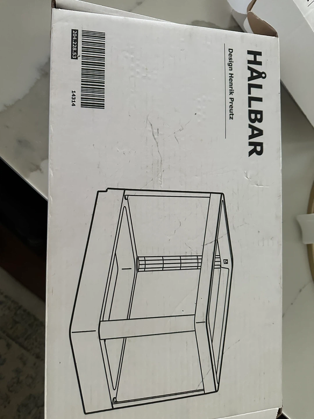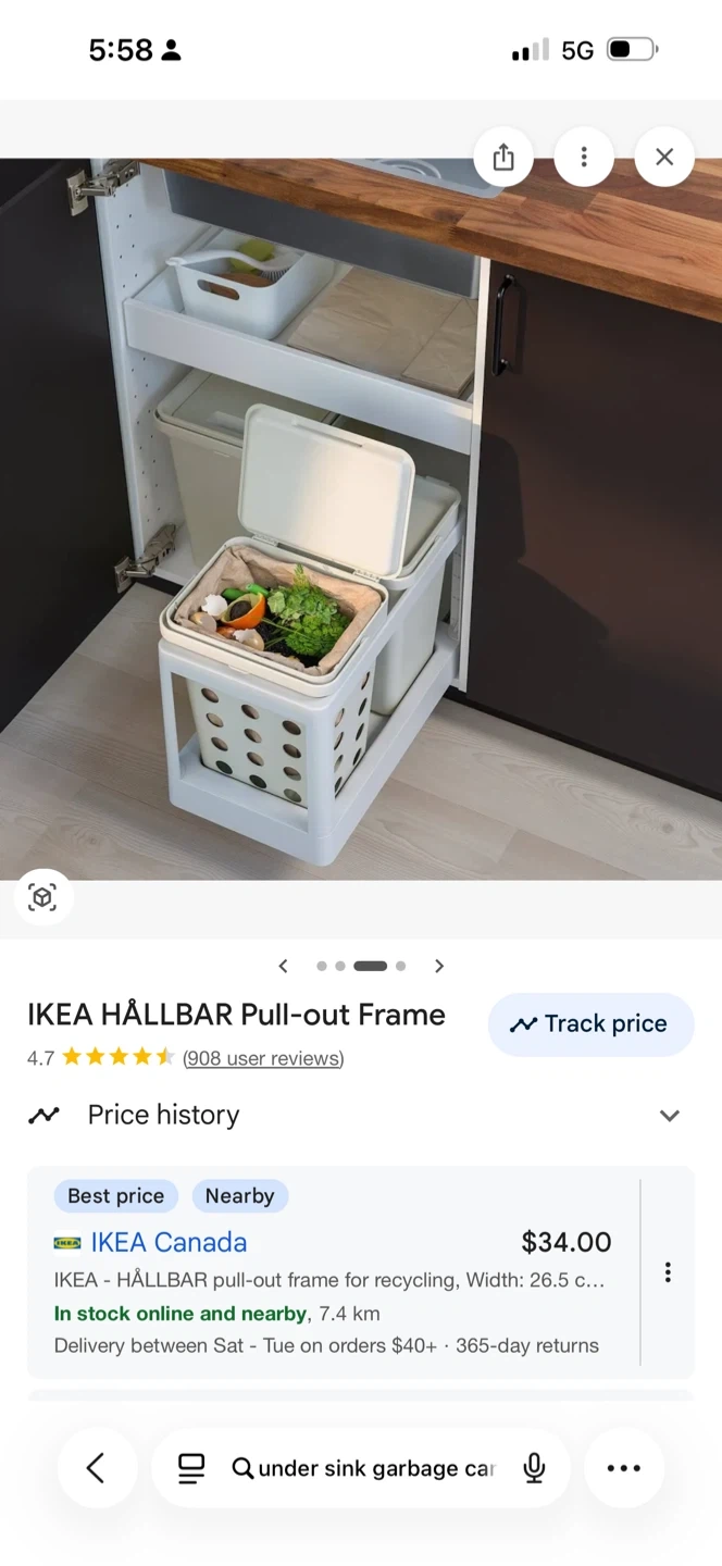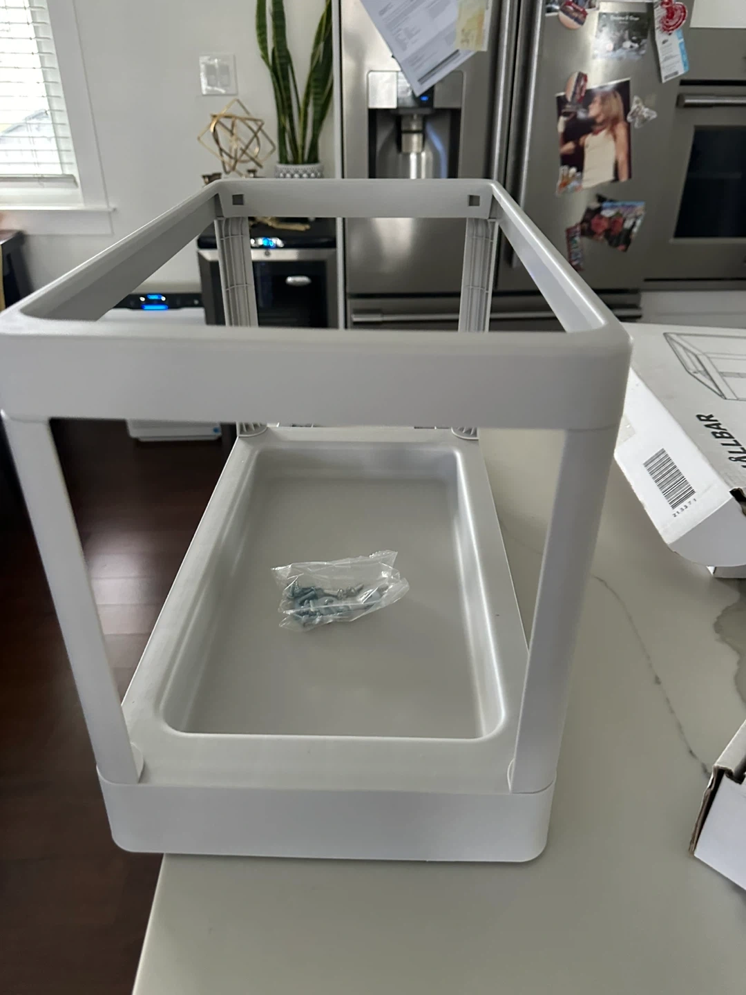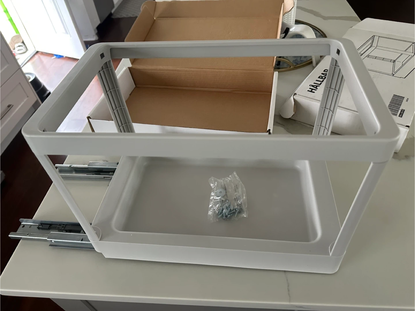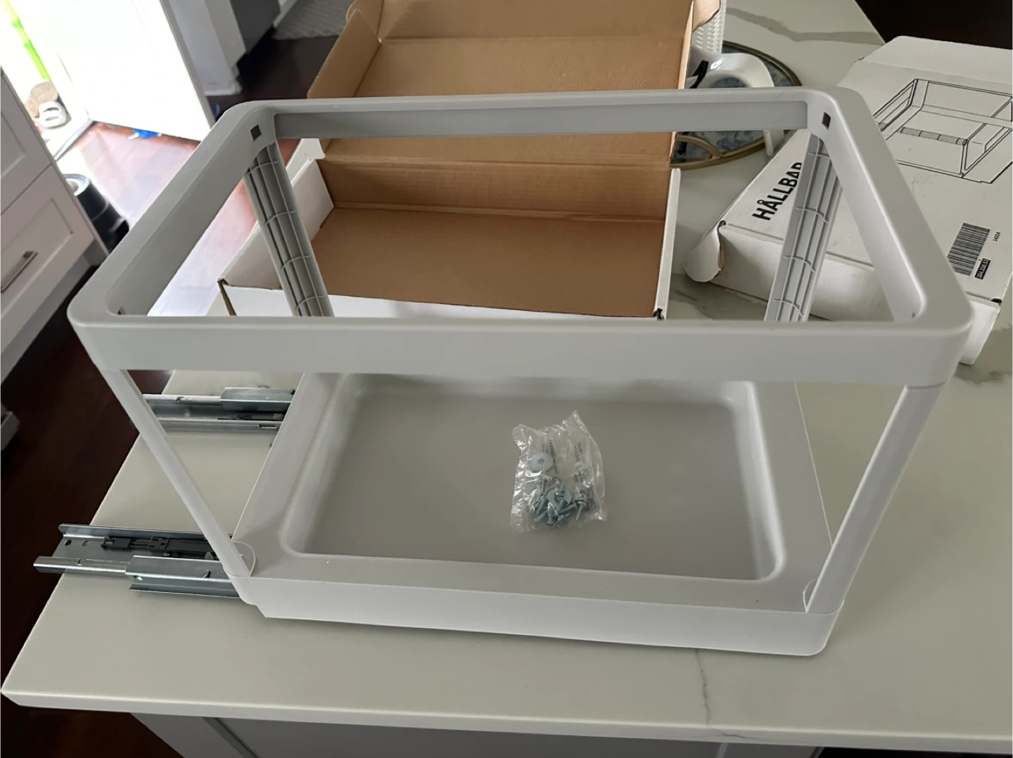 This is the IKEA HÄLLBAR pull-out frame, perfect for organizing your kitchen or under-sink space. It's designed for easy access to recycling bins or trash cans. The frame is white and includes the necessary screws for assembly.