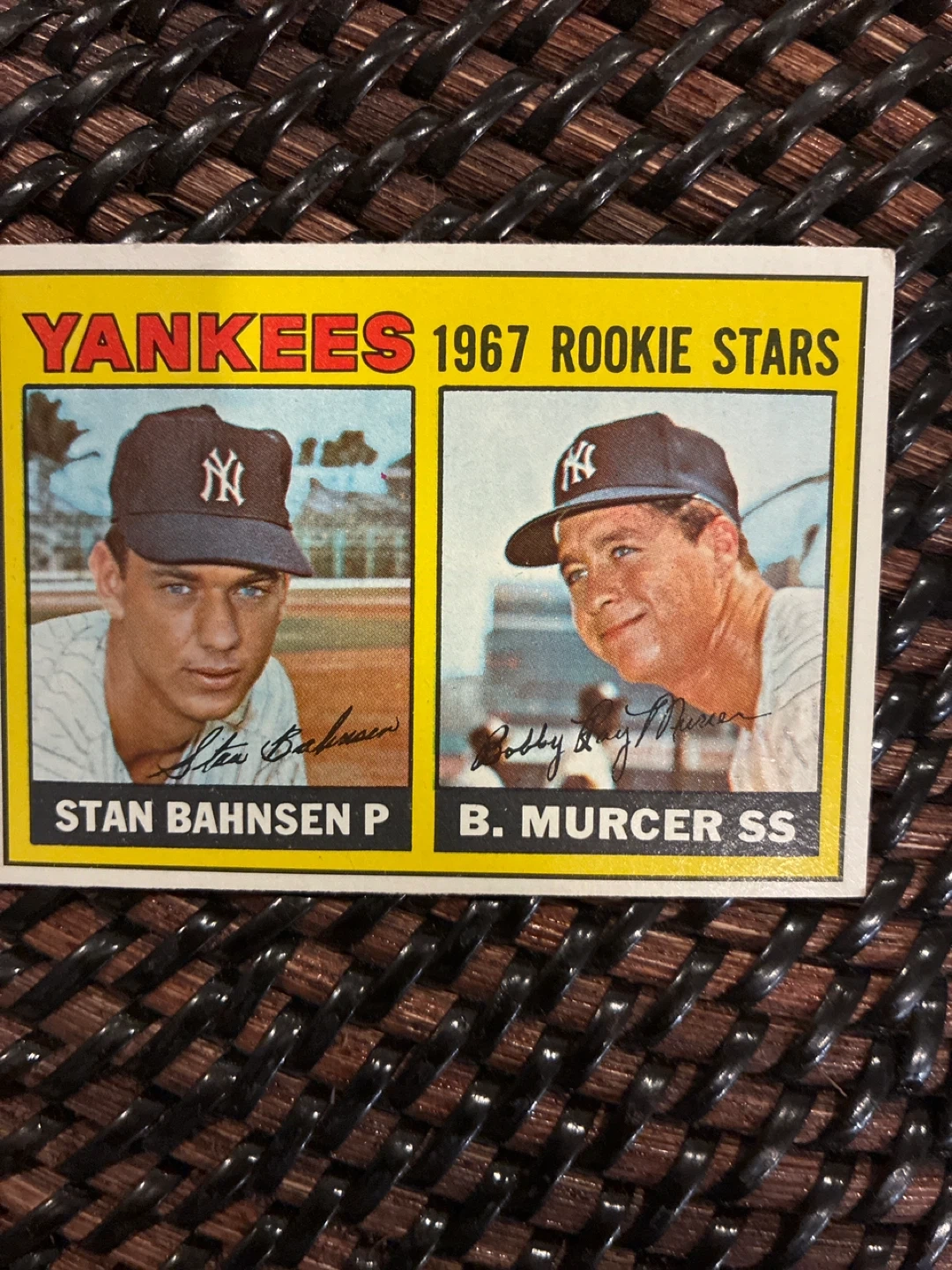 This is a vintage 1967 Topps New York Yankees rookie baseball card featuring shortstop Bobby Murcer and pitcher Stan Bahnsen. Rookie cards are very collectible. The card includes player statistics and biographical information.