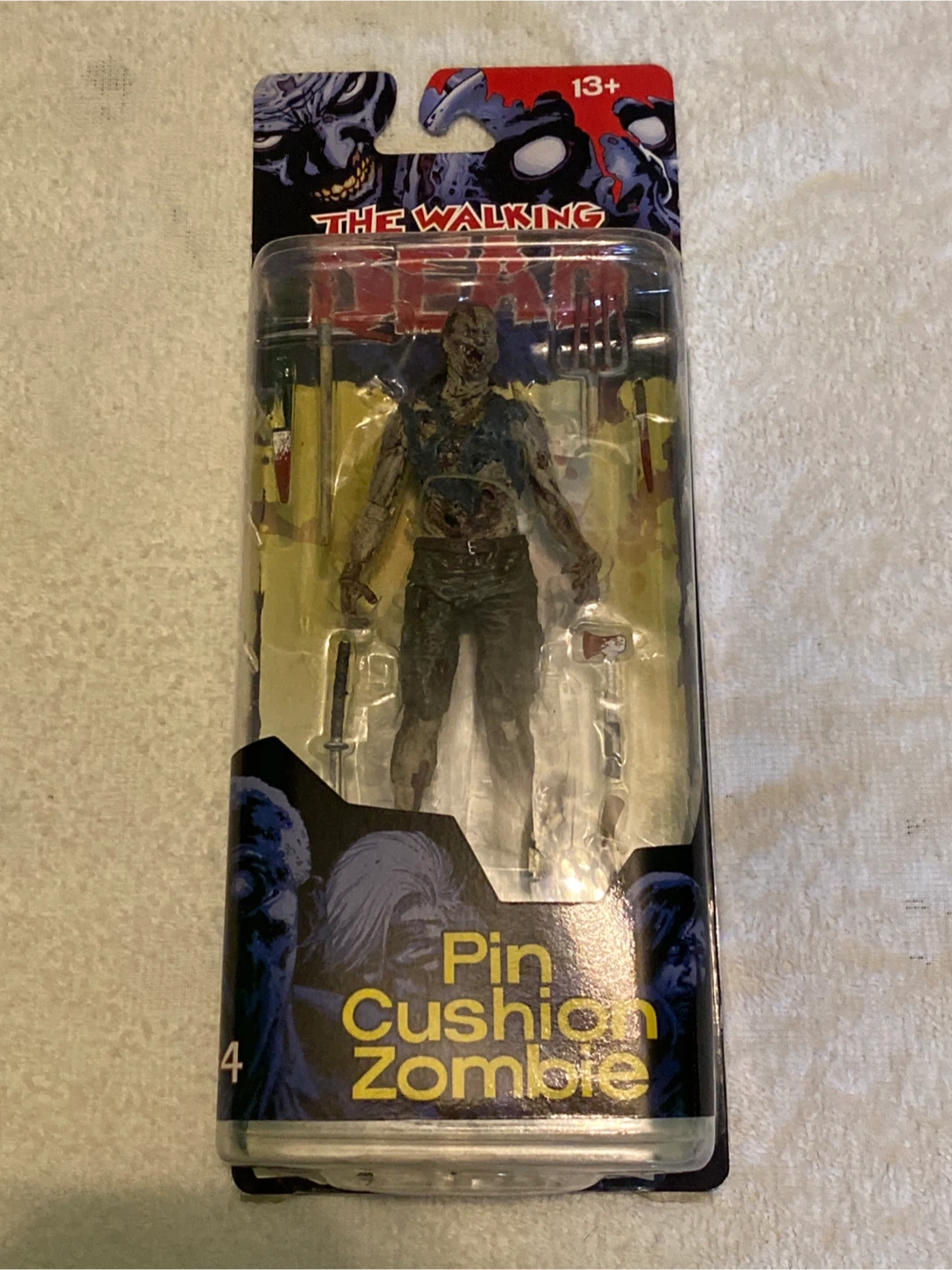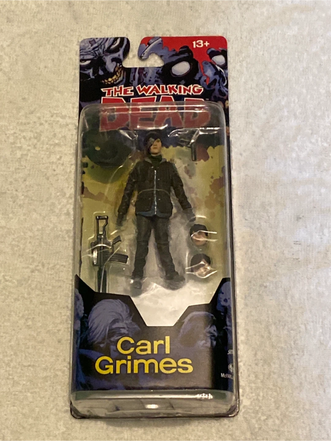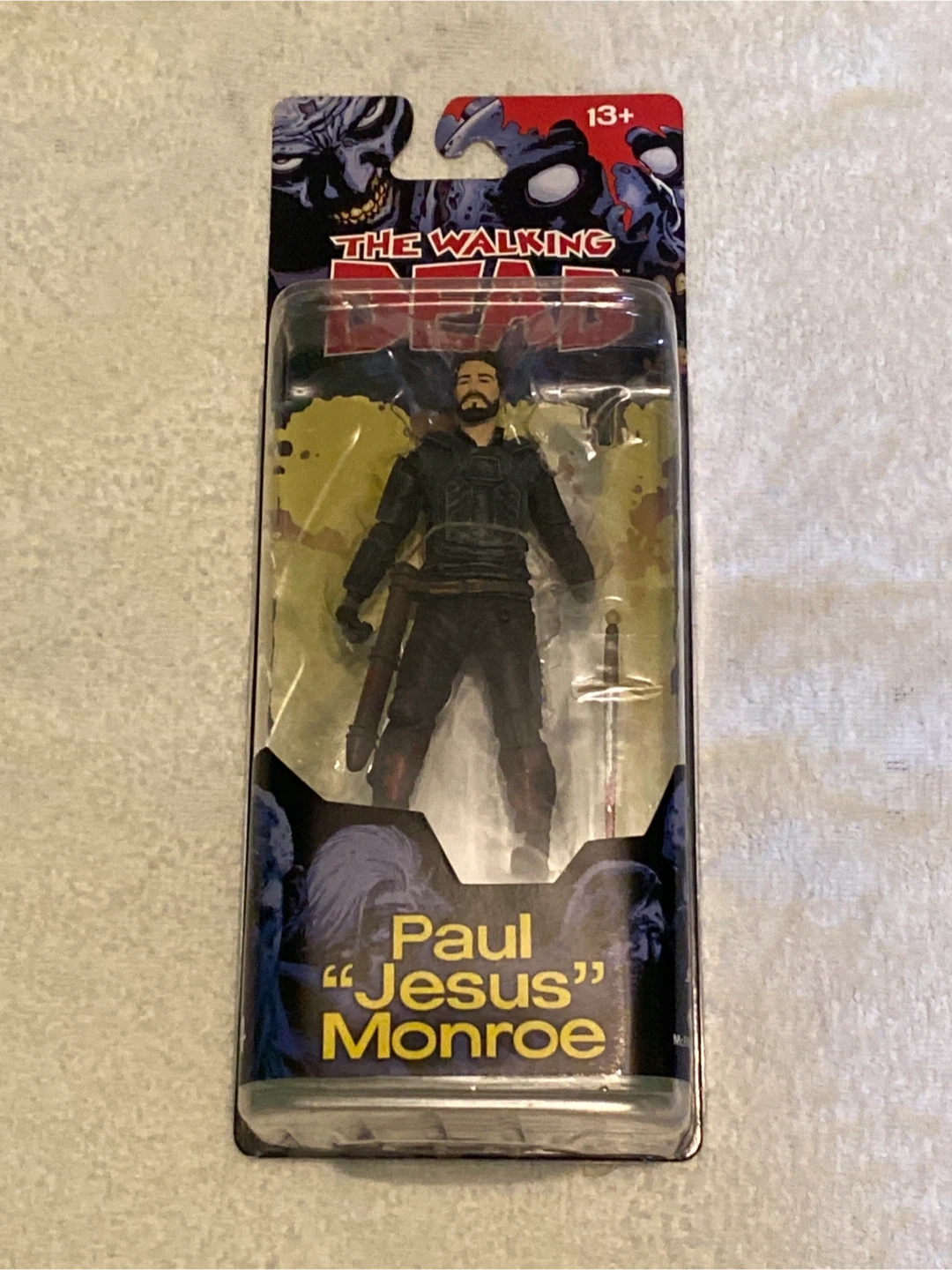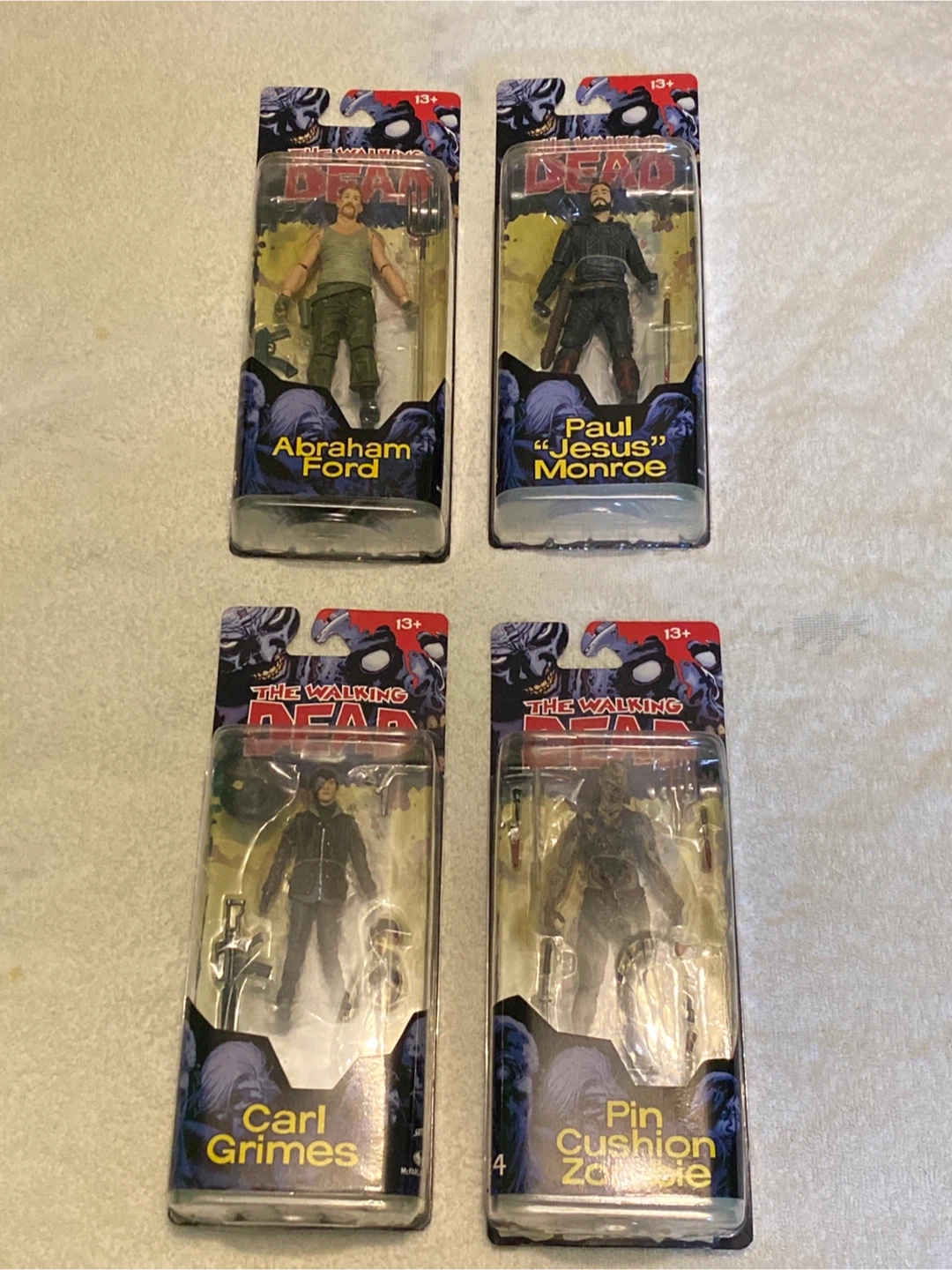 Set of four collectible action figures from The Walking Dead series. Includes Carl Grimes, Abraham Ford, Paul "Jesus" Monroe, and a Pin Cushion Zombie. Each figure is in its original packaging and suitable for ages 13+.