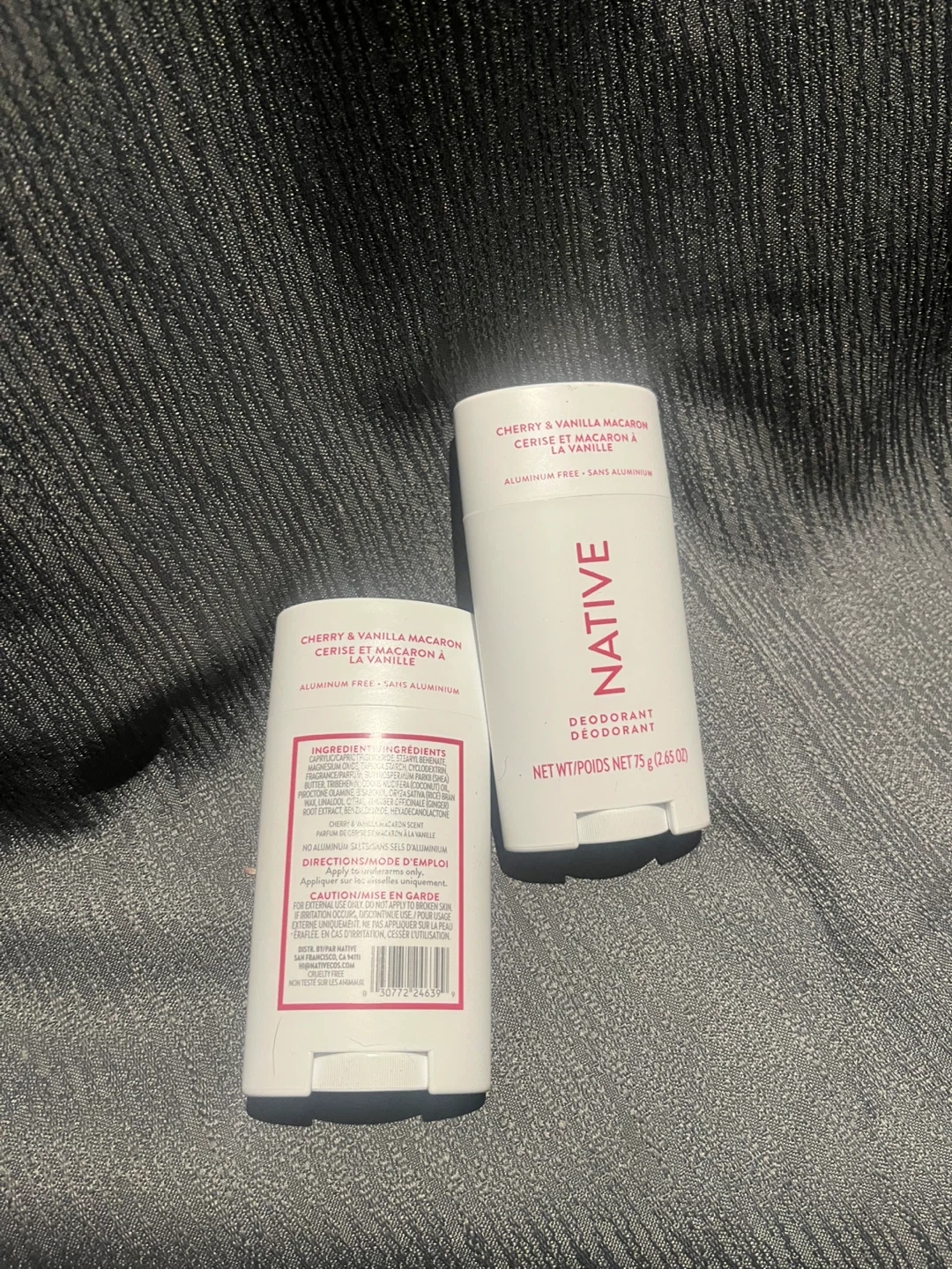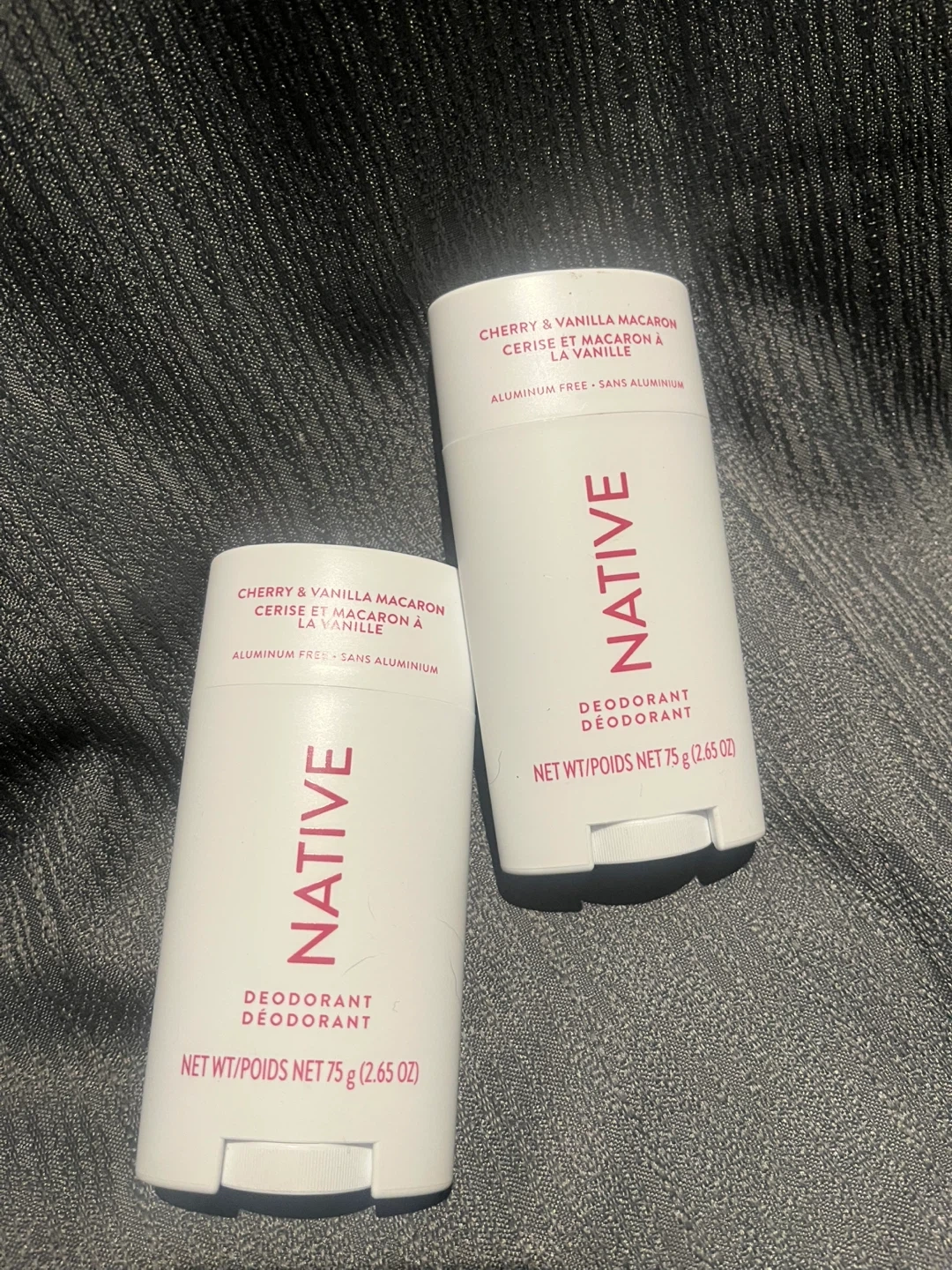 Two Native deodorants in Cherry & Vanilla Macaron scent. Aluminum free and paraben free. Each stick is 75g (2.65 oz).