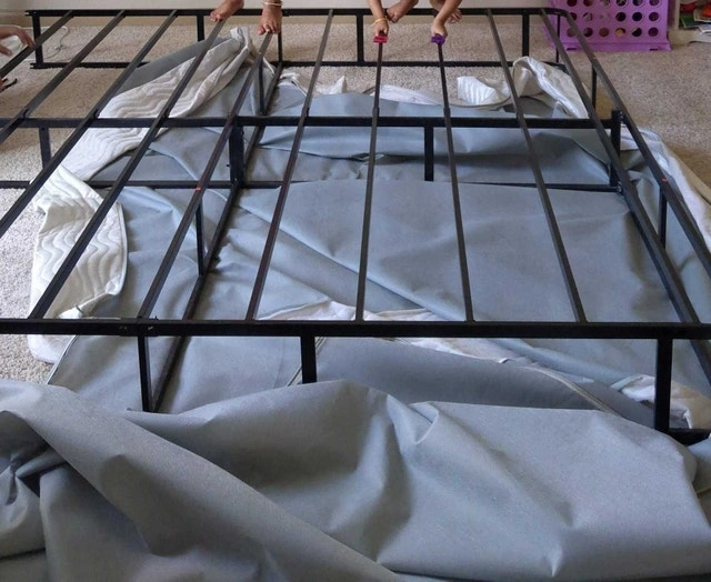 This full-size bed frame provides sturdy support with its metal construction, perfect for any bedroom. The frame is in used condition but has been well maintained, providing reliable support.