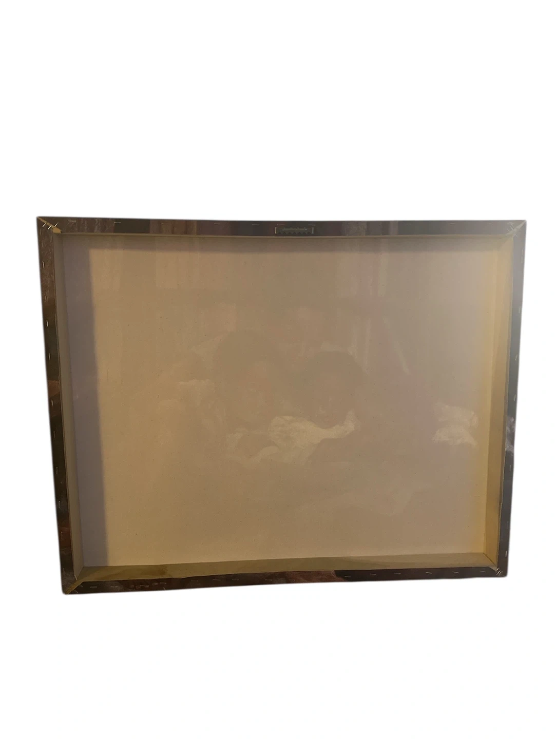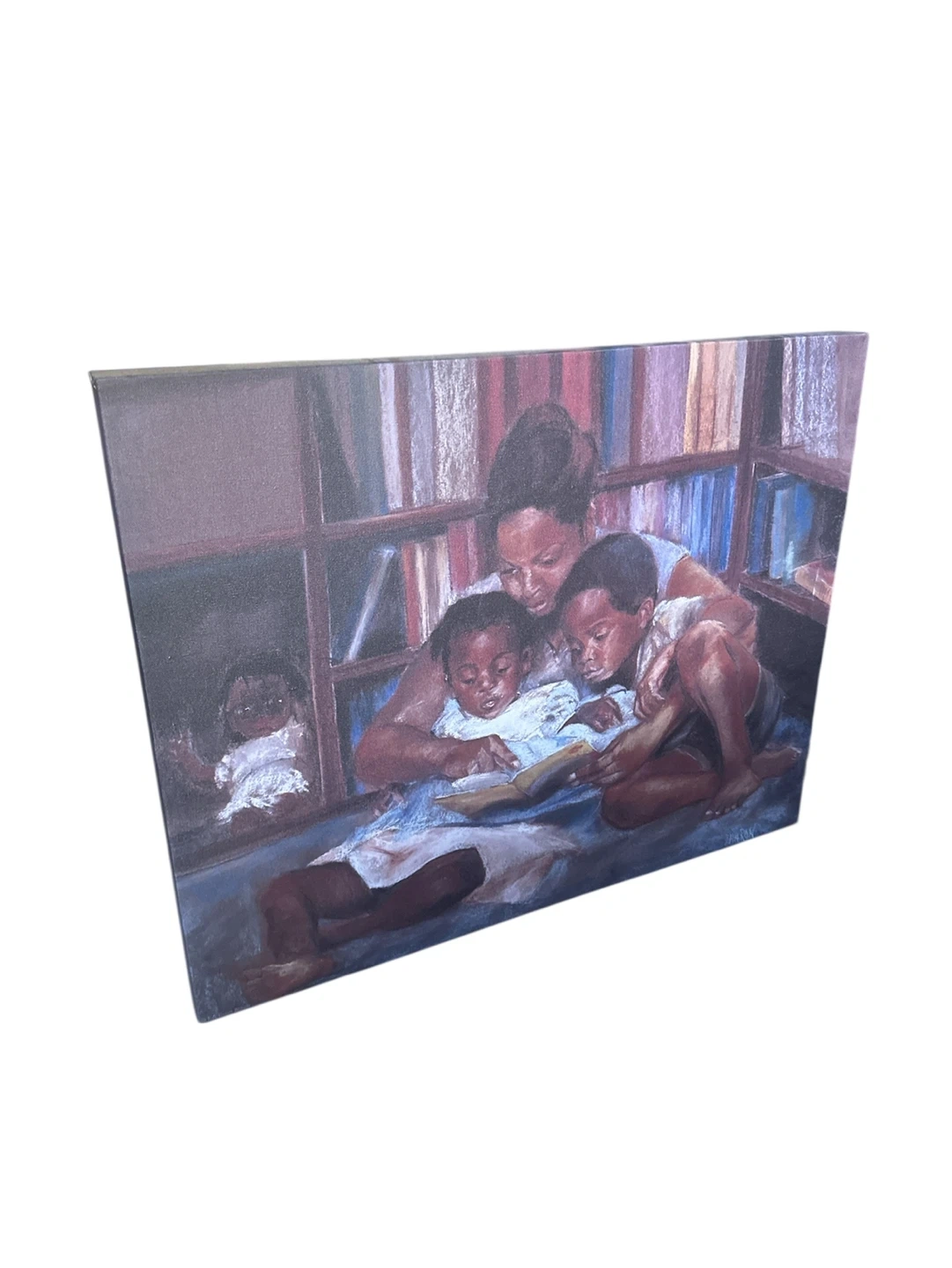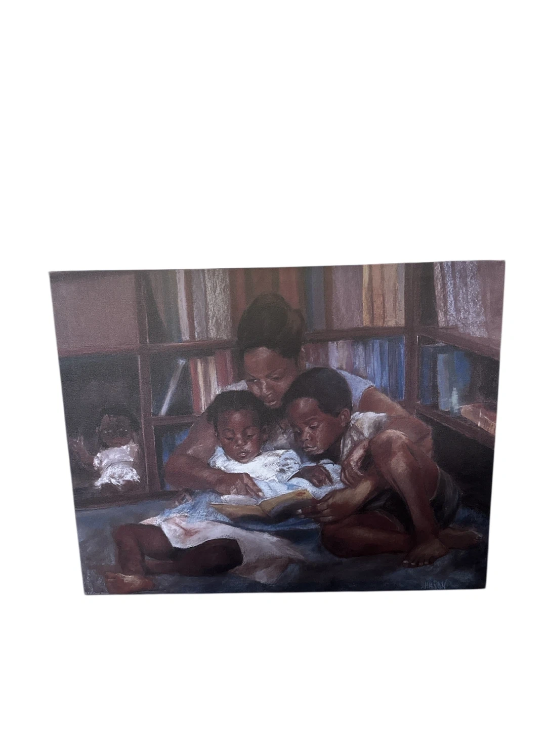 This is an oil painting depicting a mother reading to her two children in a library setting. It's a canvas print with a wooden frame. The artwork showcases a warm, domestic scene. #decor #home #painting #art #artandcollectibles cash only. Bronx pickup.