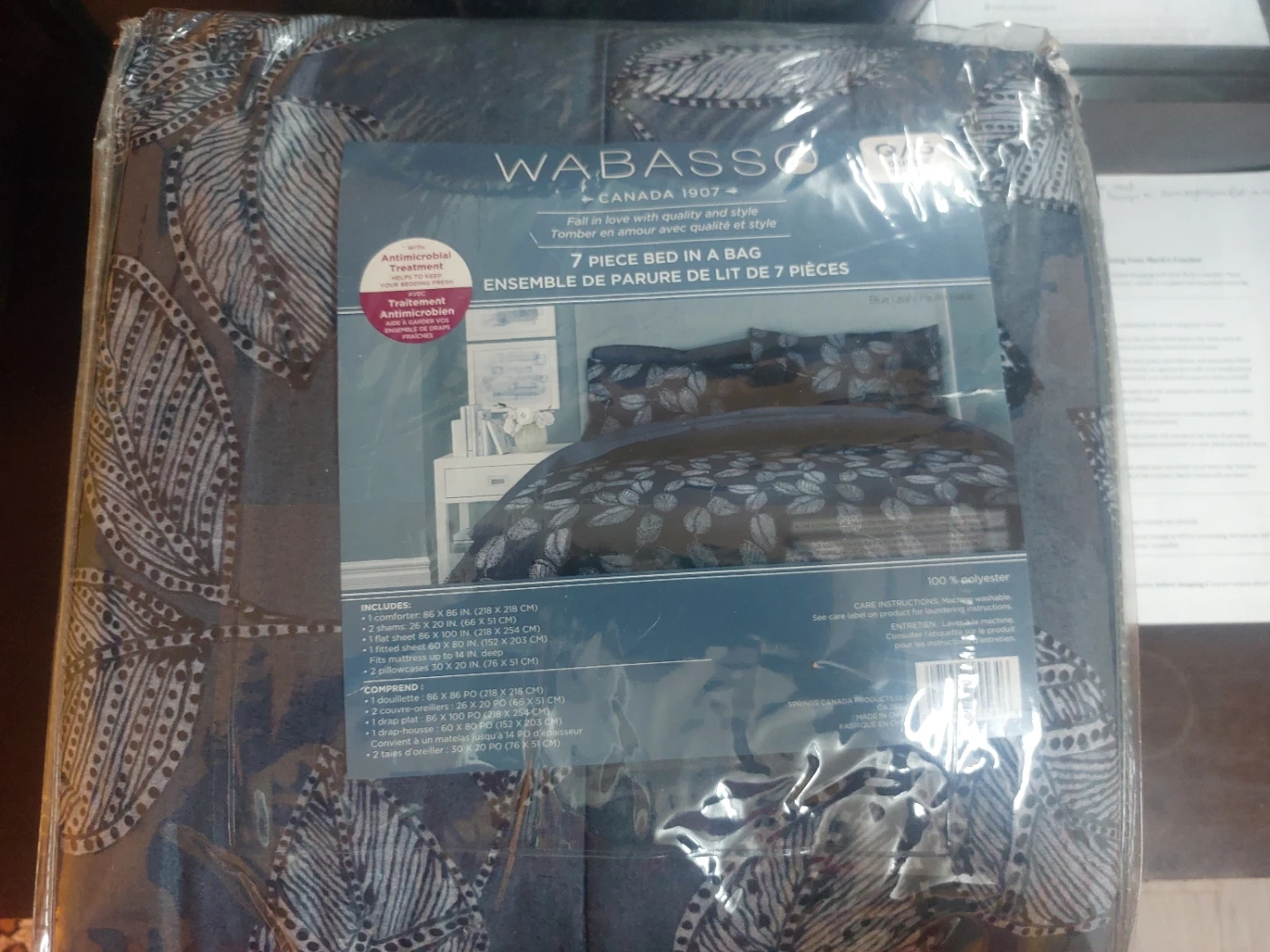 Brand new Wabasso 7-piece bed in a bag set. It includes 2 pillow shams, 2 decorative pillows, 1 fitted sheet, 1 flat sheet, and 1 duvet cover. The set is made from 100% polyester and features an antimicrobial treatment.