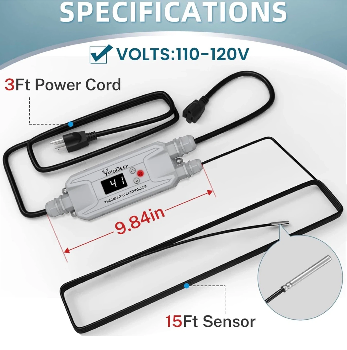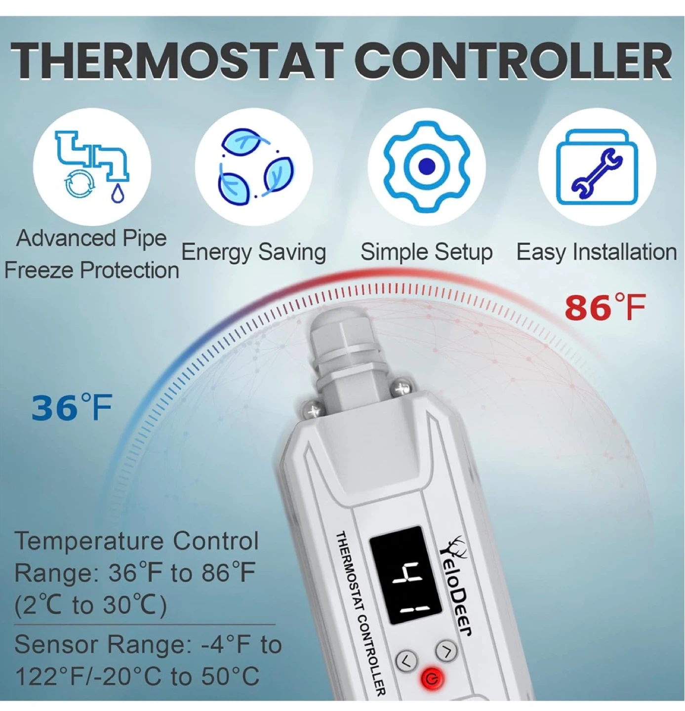 This YeloDeer thermostat controller is designed for in-pipe and on-pipe heating cables. It features advanced pipe freeze protection, energy saving capabilities, and simple setup. The temperature control range is 36°F to 86°F, and it has a sensor range of -4°F to 122°F. This unit has a 3ft power cord and a 15ft sensor.