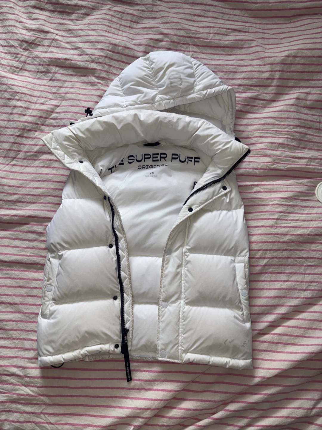 This is a white, hooded puffer vest from Tia. It's the Super Puff Original style. Size is XS. Perfect for layering on cooler days!