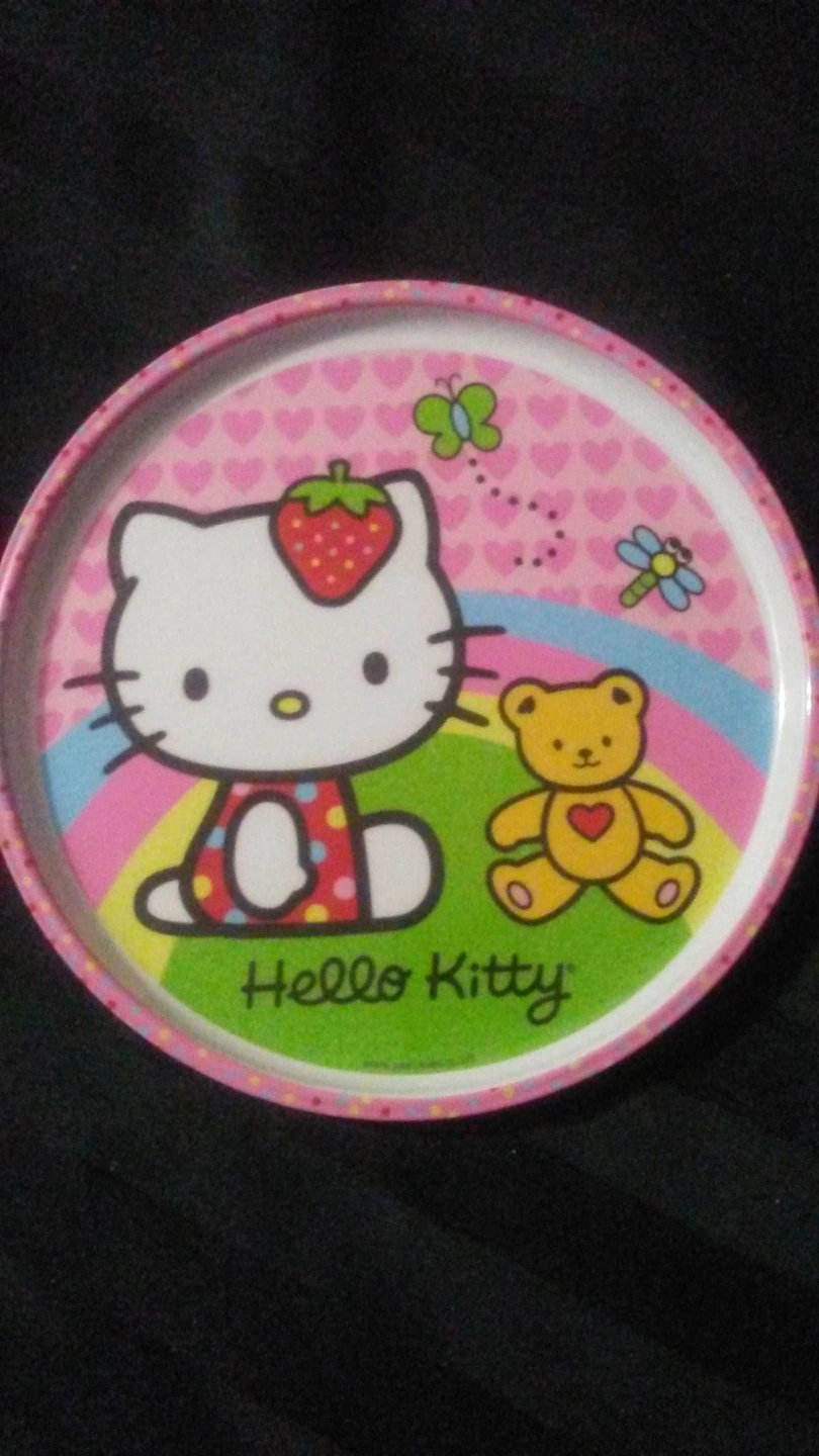 A cute Hello Kitty decorative plate featuring Hello Kitty, a teddy bear, and a butterfly on a pink background with hearts