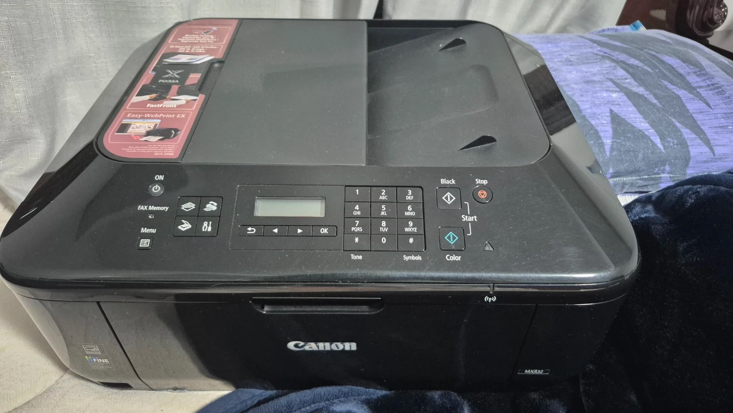 This is a black Canon PIXMA MX432 all-in-one printer. It supports printing, copying, scanning, and faxing. It's equipped with FastFront and Easy-WebPrint EX capabilities. Never Used.