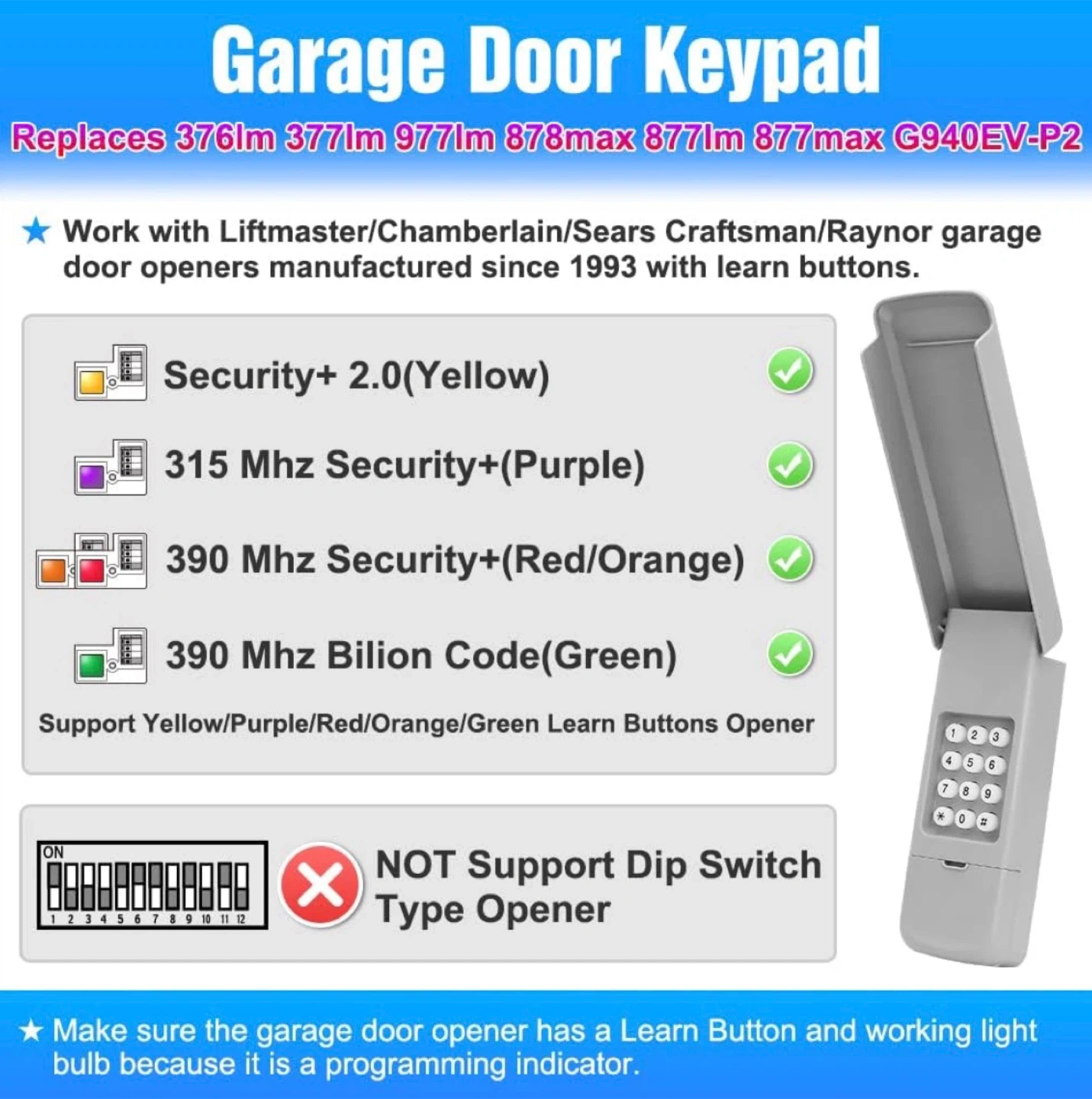 Control 3 different garage doors with one keypad. Features a backlit number pad and Security +2.0 and rolling code technology. Compatible with Liftmaster/Chamberlain/Sears Craftsman/Raynor garage door openers manufactured since 1993 with learn buttons.