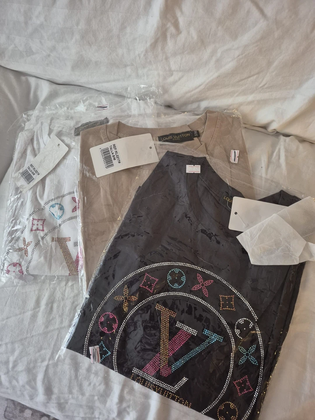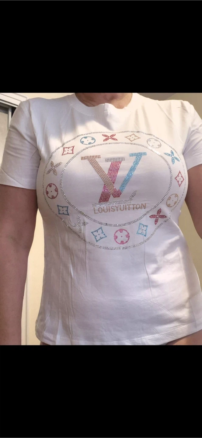 Three Louis Vuitton-style t-shirts adorned with sparkling rhinestones. Includes white, beige, and black options. These shirts feature a distinctive LV logo design.
