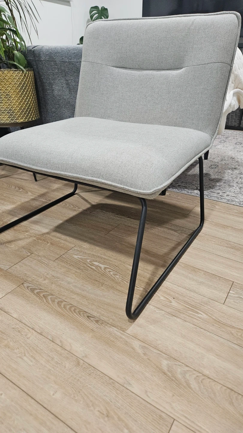 This accent chair features a comfortable upholstered seat and back in a light grey fabric. It's supported by sleek black metal legs for a modern look. This chair is a nice addition to any living room or bedroom space.